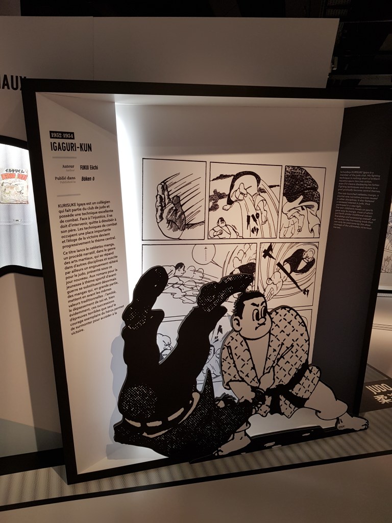 Je ne suis pas une spécialiste du genre, mais rapidement je me suis laissée captiver par le contenu historique et symbolique des compositions. On apprend qu’au lendemain de la seconde guerre mondiale, les autorités américaines ont interdit les arts martiaux au Japon. Ce bannissement ne sera levé que sept ans après, en 1952. Les mangas sportifs, ont influencé plus d’un athlète en devenir et les a énormément inspirés. Grâce à un déploiement chronologique, on remonte le temps. Les valeurs véhiculées se sont progressivement diluées laissant la place à plus de légèreté. Si certains héros s’adonnaient auparavant à cette discipline pour s’en sortir et remonter la pente, de nos jours, ils ou elles le font pour se retrouver entre amis, pour draguer ou simplement parce que dans le pays du soleil levant, faire du sport lors de son cursus scolaire fait partie des mœurs.
