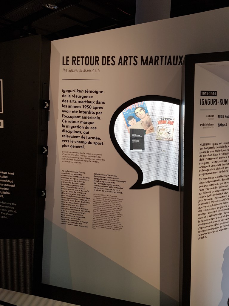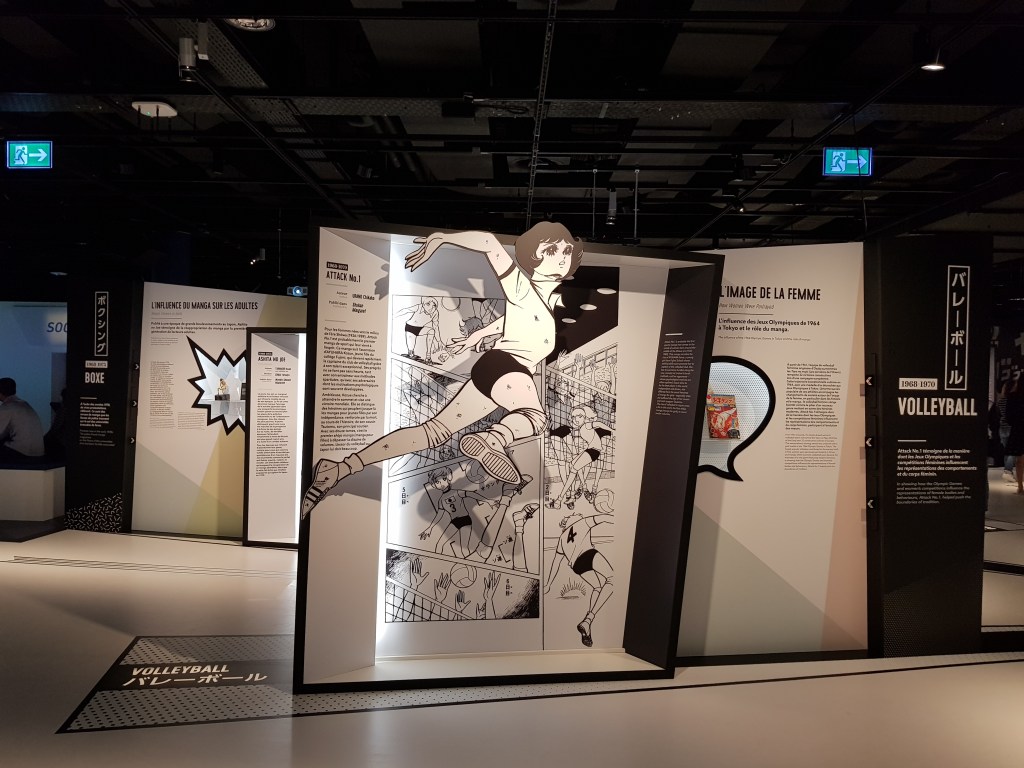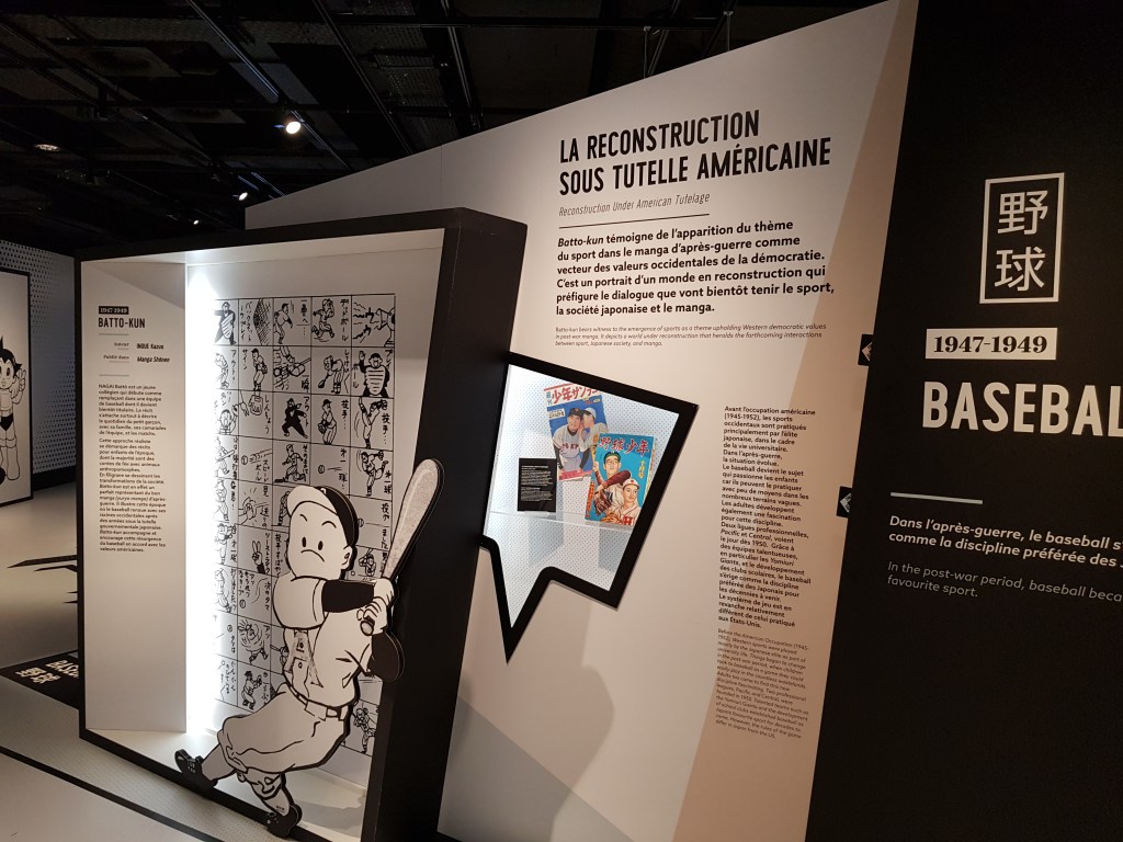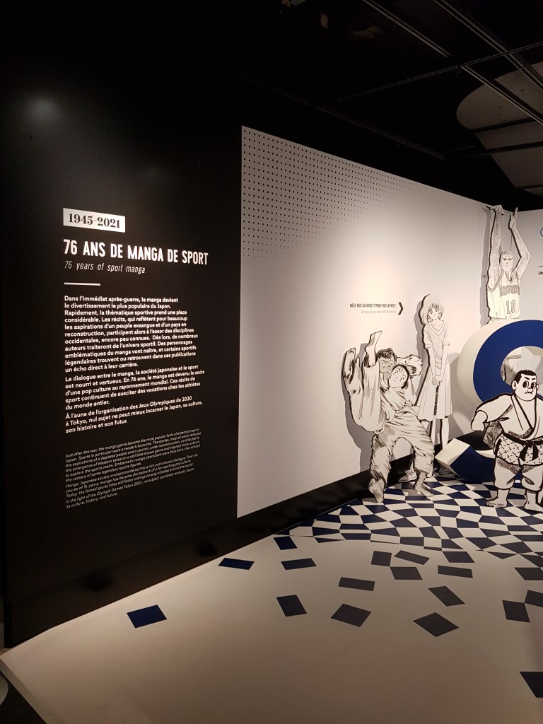 Pour bien finir la visite, je vous recommande de vous plonger dans la projection murale des sorties mangas à thème sportif, de l’après-guerre à nos jours. Ils sont classés par année de parution et discipline. Il y a dans un premier temps le baseball, la boxe et le football, puis le basket, le football américain, le tennis, le ping-pong, la danse, l’escrime et enfin l’athlétisme.