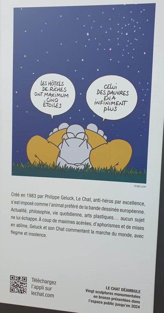Le facétieux chat de Philippe Geluck est sur les routes. Il était à la fête sur les Champs-Elysées puis en Gironde où 20 statues en bronze à son effigie toisaient les passants. Il sera prochainement visible dès le 2 octobre à Caen puis dans d’autres villes avant d’achever son périple à Bruxelles à l’occasion de l’ouverture du futur musée du Chat et du dessin d’humour en 2024, une décision qui suscite hélas pas mal de polémiques inutiles.