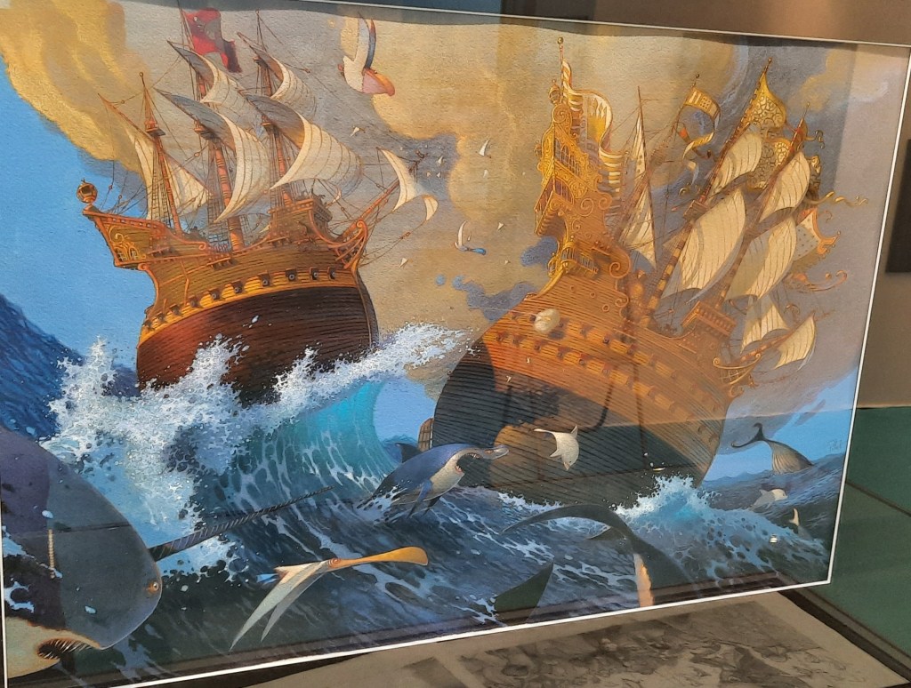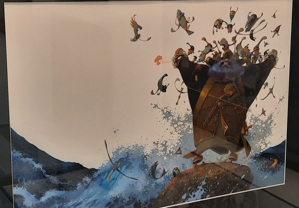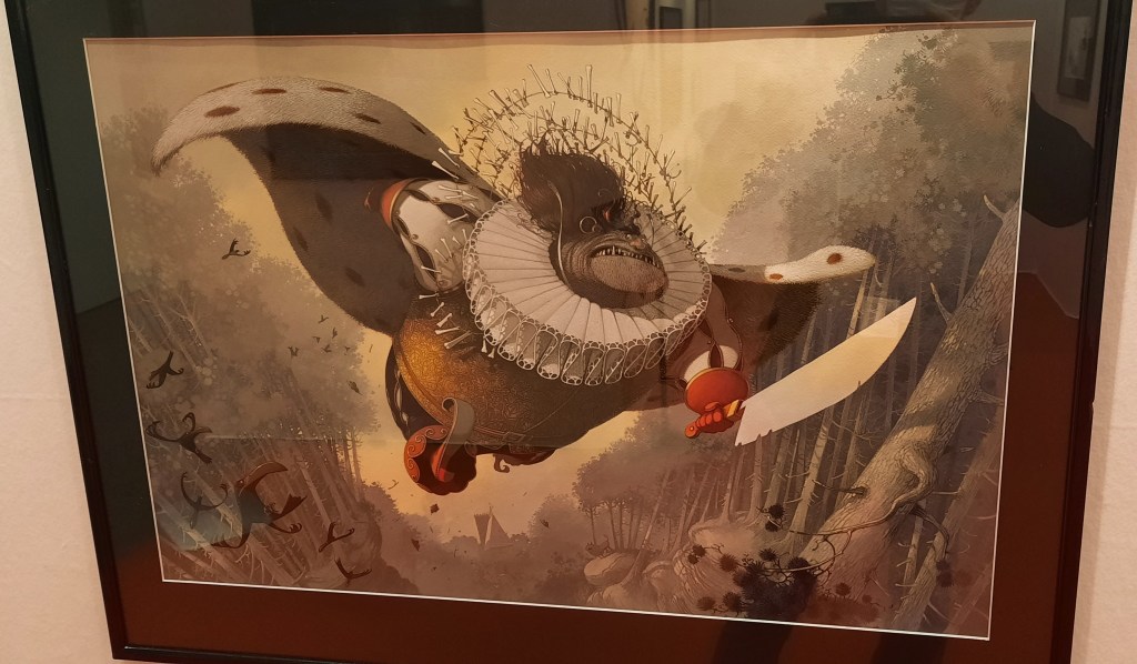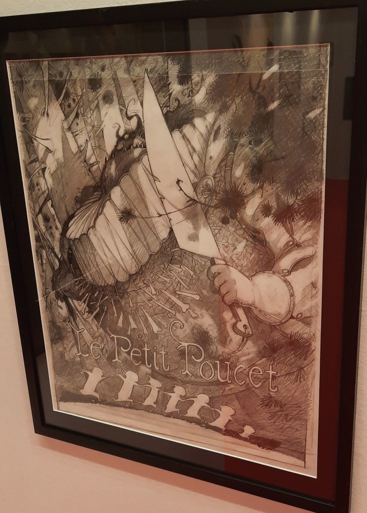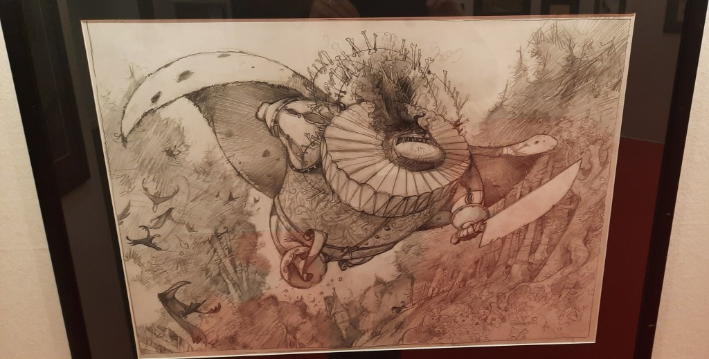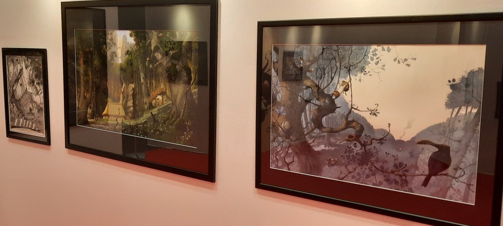 On pouvait admirer ses héros les plus célèbres et revisiter en sa compagnie les contes qui bercèrent notre enfance. Les esquisses présentes ça et là permettaient d’admirer la composition inspirée des images et les très nombreux détails. La scénographie mettait parfaitement en relief une maîtrise étonnante de la colorisation à l’acrylique ou à l’aquarelle et l’usage toujours judicieux de nombreux effets qui nous en mettent plein les yeux.