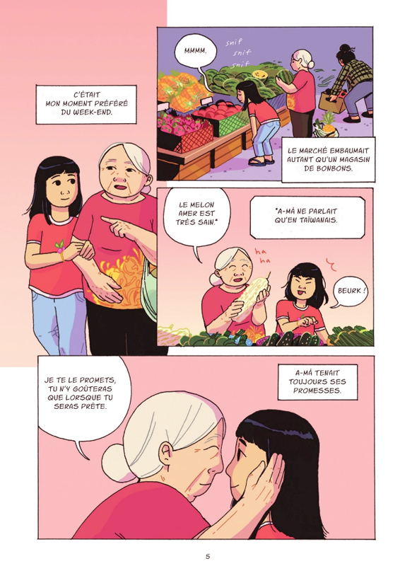 Le concours de cuisine tient le lecteur en haleine, et lui propose de savoureux regards croisés sur différents types de cuisine, taïwanaise, française, italienne… Au-delà, les 207 pages, écrites à la première personne, laissent le temps de suivre comment Cici découvre et s’adapte petit à petit à la société américaine, et surtout comment elle jongle pour répondre à la fois aux attentes et nouveautés – multiples – et à son désir très profond et touchant de revoir son A-Má. Si ses amies viennent à la maison, ne vont-elles pas fuir devant les coutumes taïwanaises ? Comment annoncer une mauvaise note à son père sans risquer qu’il la prive du concours ? Comment gagner le concours alors que Cici ne connaît aucune recette de cuisine américaine ?