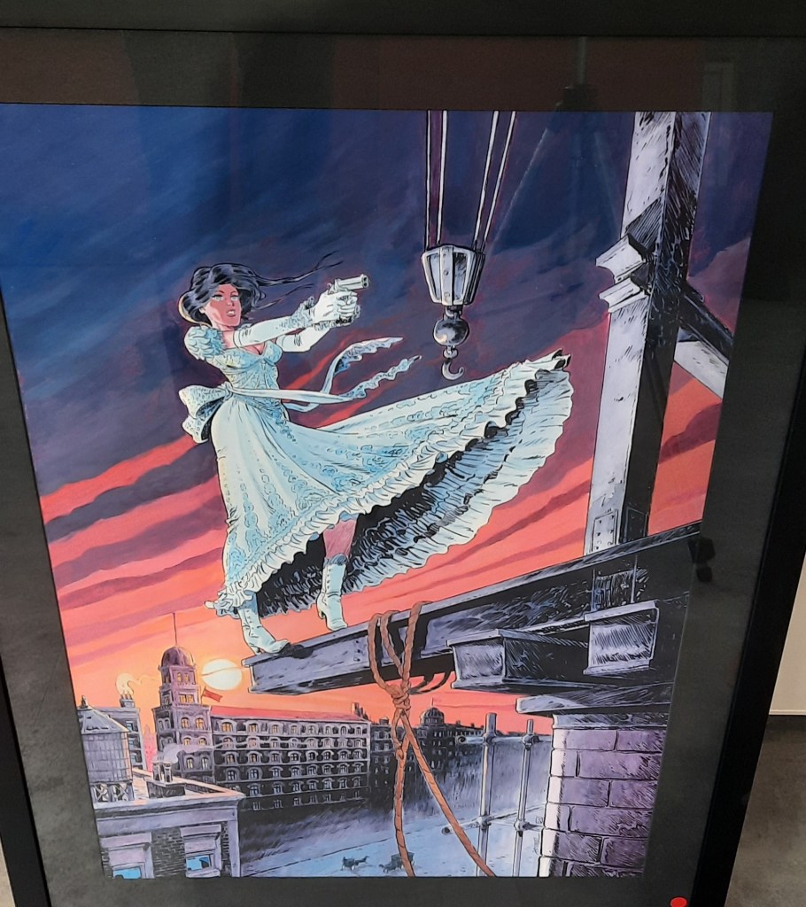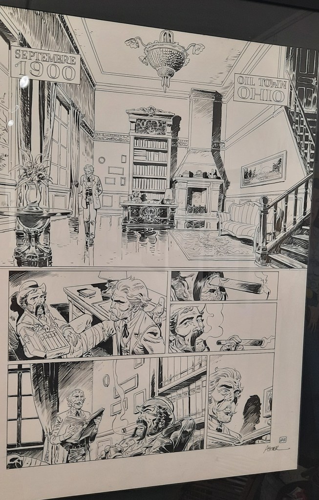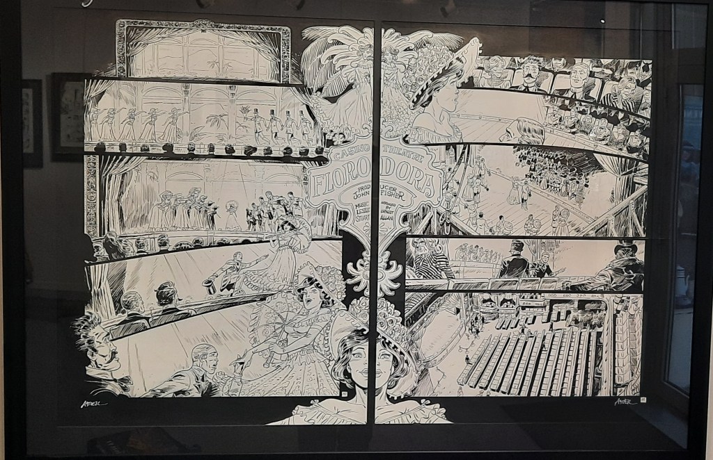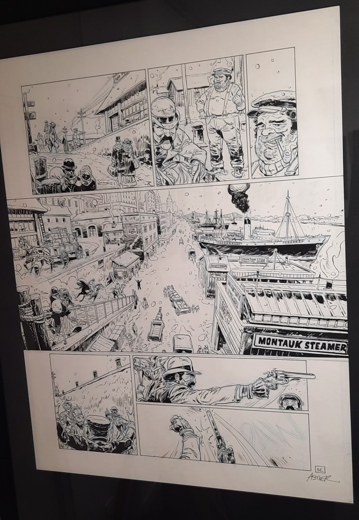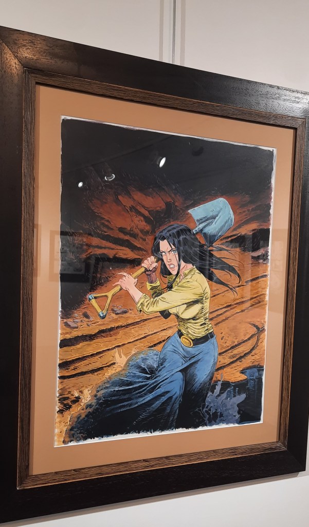 Dans des cadres noirs qui relèvent judicieusement l’encrage de l’artiste, on peut admirer des planches non colorisées qui brillent par leur format, leur dynamisme et leur composition.