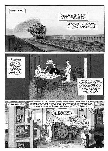 Cette date du 9 novembre n’a pas été choisie par hasard : Il s’agissait, suivant les préconisations du F.I (Front de l’Indépendance, mouvement de résistance belge), de mener une action afin de commémorer le 25ème anniversaire de l’armistice, symbole de la défaite allemande. Pourquoi le 9 et pas le 11, me direz-vous ? Affaire résolue dans l’album ! Et qui a eu cette idée folle ? C’est Marc Aubrion, alias Yvon, responsable de la presse clandestine « un grand échalas nerveux et enthousiaste » dixit Jean (René Noël de son vrai nom), le responsable du F.I pour le Brabant et le Hainaut. Le projet validé par Jean, d’autres vont rejoindre cette aventure hors du commun. Alors bien sûr, cela va demander une sacrée organisation. Il va falloir trouver en moins de 20 jours un imprimeur, du papier, un moyen de distribuer le journal et bien évidemment de l’argent. Ce 9 novembre donc, mission accomplie ! Les Allemands, à la recherche des coupables, vont pendant longtemps faire chou blanc jusqu’à ce qu’un jour … un petit détail …