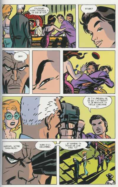 Darwyn Cooke sera l’associé idéal pour mettre en images vos péripéties. Ce spécialiste possède à son actif quelques succès d’envergure sur des projets top-secrets comme Batman Ego, DC : Nouvelle Frontière, The Spirit et les adaptations de Parker. Cooke portera la double casquette de superviseur et d’exécutant sur Le Dernier Braquage, il jonglera entre polar et soap-opéra. Comme sa mise en scène est la synthétisation du pur style des années cinquante sublimées. Son trait cartoon apportera un angle rétro, intemporel en plus de disposer d’un crayonné sombre et épuré. La représentation classique s’offrira un découpage minimaliste mais tellement expressif, l’approche sera directe voire percutante en ce qui concerne l’élaboration visuelle de la narration. Matt Hollingsworth se servira d’une colorisation dénaturée, ambiante mais tout de même raffinée. Les couleurs s’appliqueront simplement et ne comporteront que les éléments essentiels, elles seront chatoyantes comme les yeux d’un chat. Tim Sale et Dave Stewart contribueront à une participation graphique courte mais alléchante grâce à un dessin virginal au rendu voluptueux qui ne manquera pas de charme (nous y reviendrons plus en détail dans le dossier Catwoman à Rome).