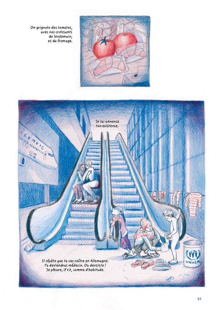 Pour autant, c’est un album empli de tendresse et de poésie, puisque la narration est basée sur le récit de la future mère à son bébé. Par exemple, elle lui dit : » je te montrerai la carte du monde, des destinations exotiques. » Lui raconte son voyage de la Syrie à la Grèce » avant que celui ci ne devienne un récit formel et froid pour le dossier de la demande d’asile « . Trouve la force pour qu’il ait un » chez soi « .
