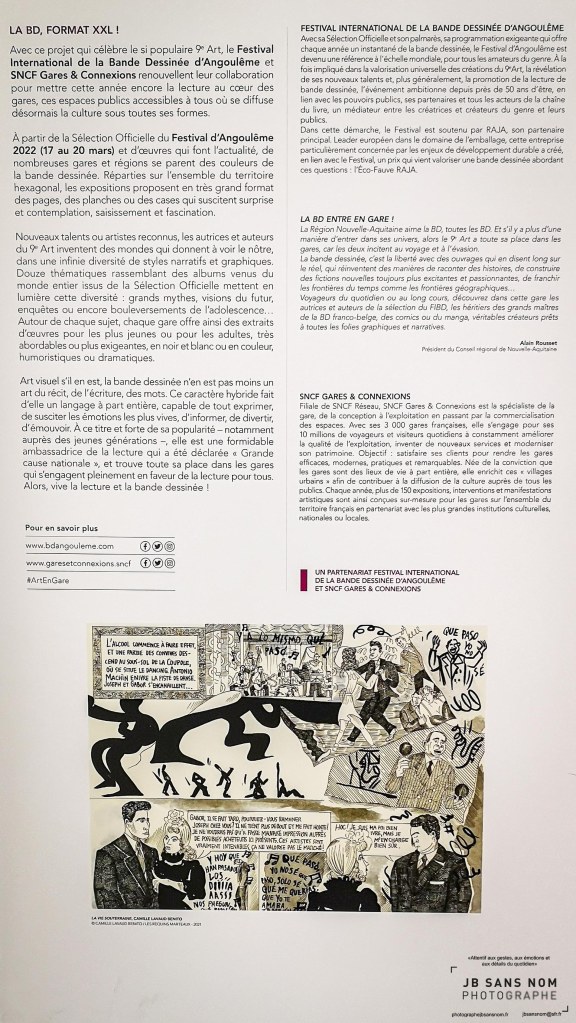 Dans le cadre du FIBD qui s’est tenu du 17 au 20 mars 2022, SNCF gares et connexions propose à ses usagers de profiter des plus belles planches en investissant 20 gares Françaises. L’opération contribue ainsi à promouvoir ce medium en le rendant accessible à tous et partout.