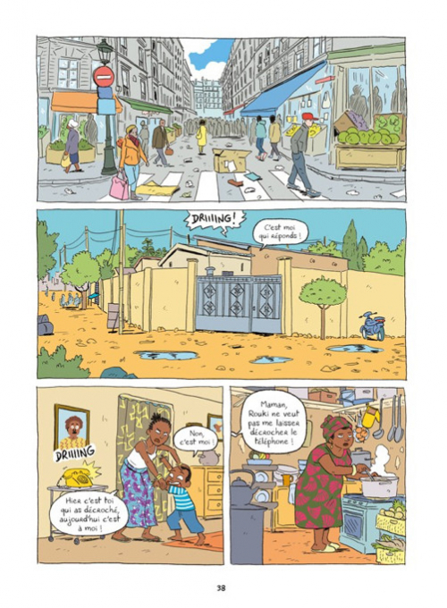 Le graphisme est construit avec des mises en parallèle réussies entre les deux pays. Les dessins mettent en évidence les contrastes entre deux mondes ou au contraire les similarités de certaines rencontres et le plaisir universel de retrouver sa famille. Des plans larges nous offrent des scènes pleines de vie. Les cases se déclinent dans des tons chauds, vifs. L’ensemble est très coloré, à l’image des tissus africains souvent représentés. Des personnages sont dessinés à presque toutes les cases, attestant de l’importance des relations sociales dans l’histoire. Les personnages ont des expressions affirmées et drôles, participant à rendre la lecture agréable et amusante.
