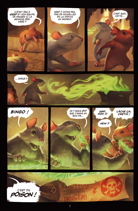 Mac Smith signe un récit palpitant. Le scénario s’élabore sur la base d’un postulat de départ assez simple puis il s’invente, se rédige chapitre après chapitre avec ingéniosité et sensibilité. L’auteur saupoudre ce deuxième volume de rebondissements et de cliffhangers haletants. Le synopsis défile à fond la caisse. Nous n’avons pas le temps de souffler une minute, nous sommes bercés par un rythme endiablé et infernal. L’auteur réussit le tour de force de rendre ses minuscules créatures attachantes, le lecteur en tombe d’affection. Ceci est une Odyssée non pas d’Homère mais animalière, une œuvre que l’on ne veut pas arrêter de lire. Cette série rafraîchissante n’a rien à envier et soutient hautement la comparaison au Bernard et Bianca de Disney, c’est dire !
