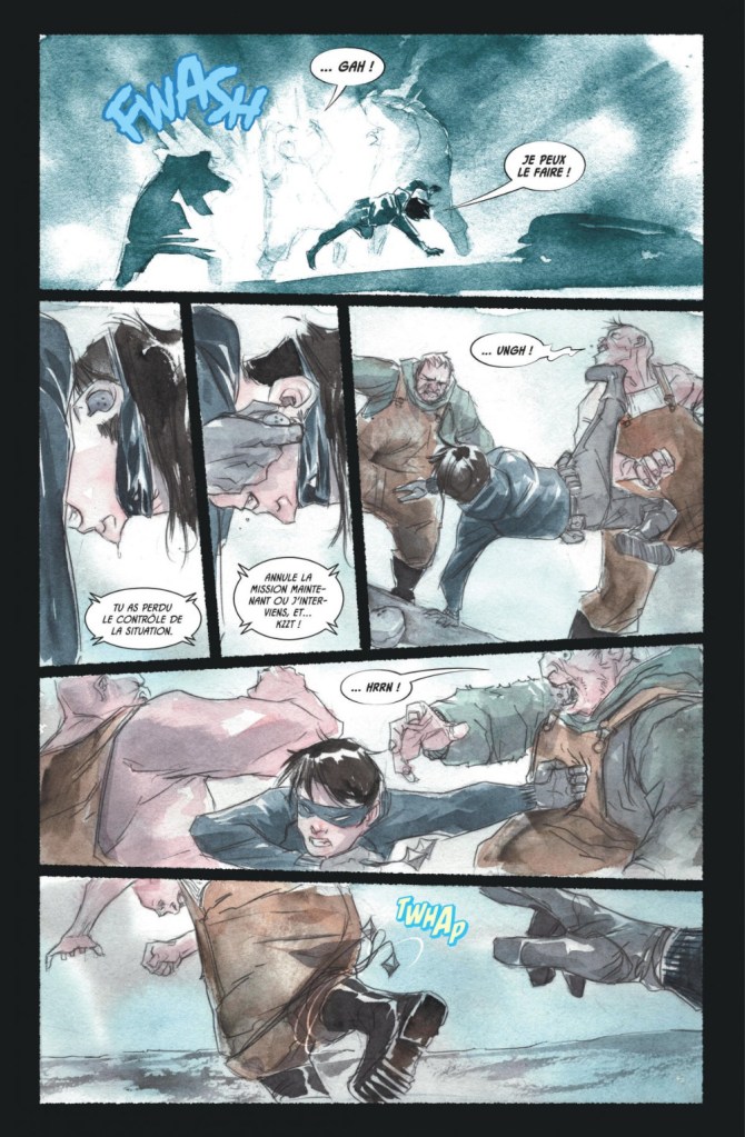 Dustin Nguyen a développé un style tout-à-fait remarquable sur plusieurs projets depuis quelques années tels que Batman Little et Contes de Gotham ou le diptyque Descender/Ascender. Goodbye Chinese ink and please welcome to watercolor, l’artiste opte pour la fraîcheur illustrative. La mise en couleur directe s’allie à un crayonné simple mais surpuissant. Ce graphisme ambitieux suscite l’attention, son découpage séduit par des perspectives sensationnelles et stupéfiantes. La lumière, la texture, le volume, le relief de l’aquarelle s’harmonisent parfaitement aux formes et contours du crayonné schématique. Dustin Nguyen évite la surenchère graphique pour proposer un art séquentiel prodigieux. L’utilisation du pinceau combiné à la peinture à l’eau nous charme littéralement.