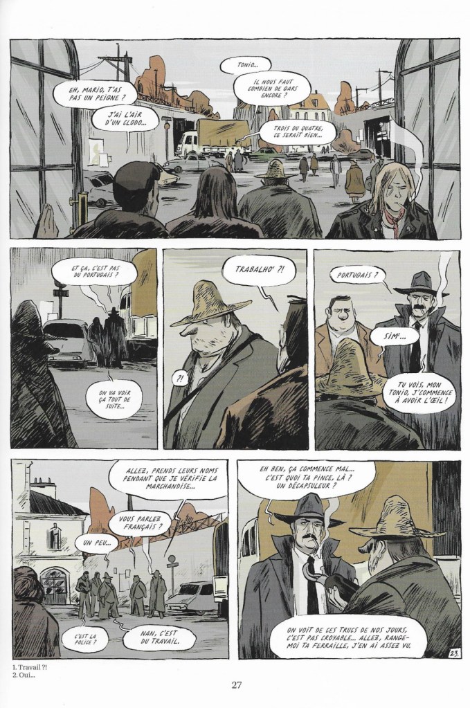 Les Portugais c’est un one shot imaginé par Olivier Afonso, édité par Les Arènes bd qui retrace l’aventure en France de deux immigrés clandestins qui fuient comme beaucoup de leurs compatriotes l’autoritarisme de Salazar, la guerre, la récession et la misère.