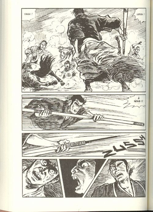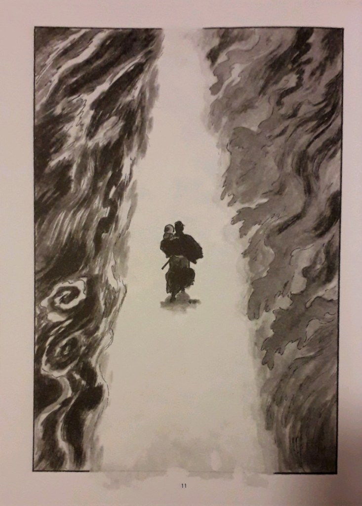 Ce captivant scénario est servi par les magnifiques dessins de Goseki Kojima. Amateurs de mangas dont les personnages ont des nez pointus minuscules, des visages triangulaires et des yeux immenses, passez votre chemin. On est ici sur des représentations alliant réalisme et « impressionnisme ». Ce manga reprend le découpage des actions cher au cinéma de sabre japonais de la même époque. Alternent ainsi des temps lents aux traits précis et posés et des scènes d’actions époustouflantes allant jusqu’à une certaine déformation des proportions qu’on aurait tort de prendre pour une absence de maîtrise. Le noir et blanc sert particulièrement la narration et l’on retrouve l’atmosphère des films d’époque. Il est intéressant de noter que dès le deuxième volume, on assiste à une certaine évolution de la mise en images avec des plans larges plus nombreux, parfois sur deux pages, et qui ne sont pas sans rappeler les cadrages des westerns de Sergio Leone. Ainsi cette magnifique scène où le lecteur est légèrement au-dessus du sol, les herbes couchées par le vent au premier plan et, un peu plus loin, deux samouraïs s’observant un long moment avant d’en découdre…