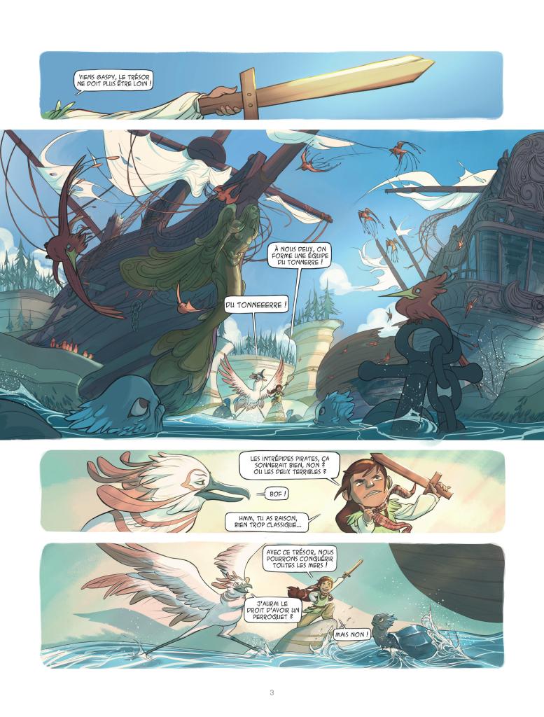 « La traversée interdite » amorce une série qui comprendra 3 tomes. Elle s’ouvre avec un premier chapitre attrayant et prometteur, qui nous donne clairement envie de connaître la suite des périples de nos deux amis. Affublez-vous de vos plus beaux habits de corsaire, d’une bonne dose de courage et allez braver les dangers avec Rosamée et Gaspy ! À l’abordage flibustiers !