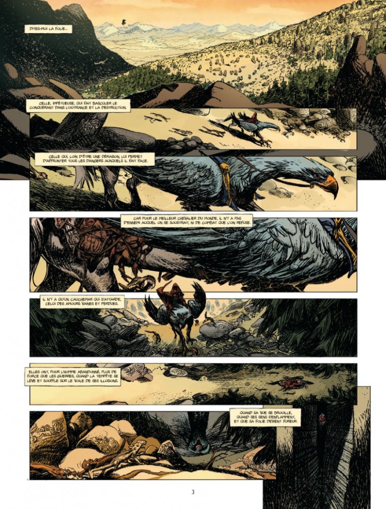 Derrière cette intrigue originale se trouvent deux poèmes, chefs d’œuvre du XVIe siècle : Roland amoureux et Roland furieux, des poètes italiens Boiardo et l’Arioste. Le monde imaginaire décuple l’univers de Roland dont il s’inspire : arènes monstrueuses et leur trône baroque, ptérodactyles fondant du ciel, effrayantes créatures marines, homme-dragon, trolls, banshee se succèdent dans un rythme rapide et haletant. La professeure Théa Picquet, spécialiste de littérature de la Renaissance, conclut l’ouvrage par une analyse de cette réécriture, illustrée de généreuses esquisses.