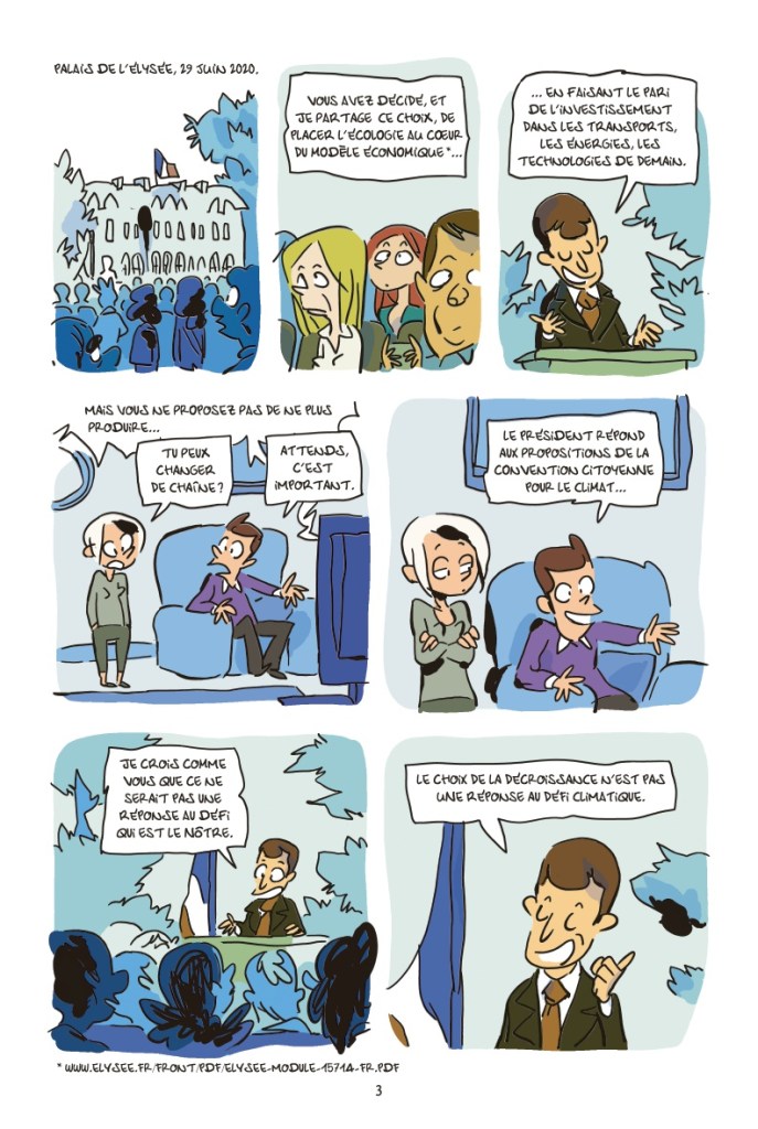 Alors que l’assemblée nationale discute un plan d’accélération du développement des énergies renouvelables, que les usines ferment en série à cause du coût énergétique, que la question climatique n’a jamais été aussi prégnante, peut-on, comme Elisabeth Borne, affirmer que « la sobriété, ce n’est pas produire moins » ? Autrement dit, notre modèle économique et la préservation de notre planète sont-ils compatibles ? Anthony Auffret s’attaque à cette épineuse question, dans une bande dessinée haute en couleurs de 152 pages intitulée Le mirage de la croissance verte et parue dans la collection Octopus des éditions Delcourt. Et s’il s’appuie sur la bibliographie incontournable sur le sujet – des rapports du GIEC et de Meadows aux apports du shift project, association visant l’atténuation du changement climatique et la réduction de la dépendance de l’économie aux énergies fossiles – il choisit un traitement résolument humoristique sur le fond comme sur la forme. La double relecture par un docteur en économie, Thimothée Parrique, et par un scientifique spécialisé en environnement et en vulgarisation, est un choix judicieux pour un ouvrage à la fois solide, équilibré et digeste.