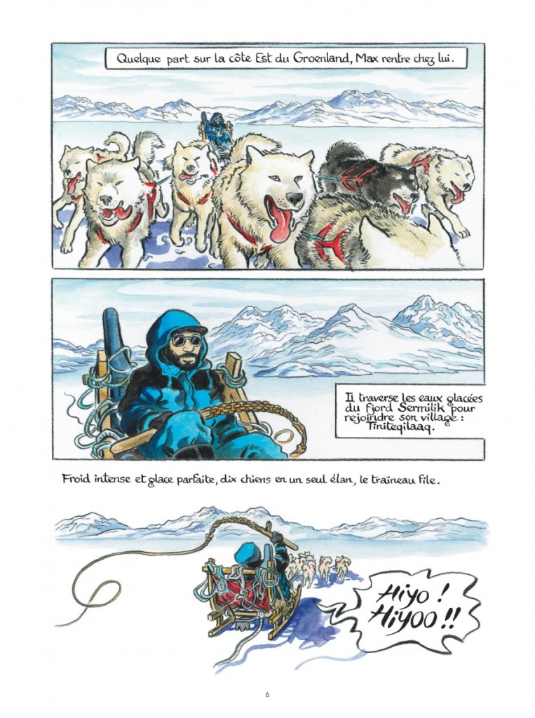 Sur plus de deux cents pages éditées par Dargaud, c’est Max que l’auteur nous raconte… Max Audibert, jeune homme occidental, marseillais, exilé volontaire en terre groenlandaise. Max et sa volonté inaltérable de devenir chasseur traditionnel à Tiniteqilaak, quatre vingts habitants, et dont Simon Hureau nous offre un portrait croqué réaliste, de l’école au séchoir à poissons. Max et ses chiens dans le blizzard. Max et son poste d’instituteur au bout de ce monde glacé. Max rejoignant sa cabane peinte en rouge et son congélateur extérieur naturel. Max et ses enfants métis. Max, devenu l’un des rares « inuits blancs » auprès de Sermilik, le plus vaste fjord du sud-est du Groenland. Au fil des pages qui retracent le parcours biographique de Max Audibert, c’est un monde bien plus vaste qui vous gagne. L’auteur alterne les vignettes au dessin riche et très fouillé comme pour la chasse aux phoques ou les travaux de construction de bateau avec des doubles pages où le trait se suffit à lui-même pour passer les émotions. On s’échappe volontiers des cases convenues de la mise en page traditionnelle vers des espaces où le blanc bleuté des paysages de banquise, les ciels rosés et les flashs de couleur des villages se déclinent pour donner épaisseur et profondeur au récit. On entre par les apprentissages et l’histoire de cet homme, qui pourrait être nous, dans un univers à la fois empreint de traditions et de modernité, une histoire d’évolutions et de racines, de découvertes et d’amitiés. On approche une spiritualité particulière où la Nature est reine. Pour autant, Sermilik, là où naissent les glaces n’est pas une ode complaisante à un mode de vie sobre et respectueux, ancré dans une culture séculaire ; c’est davantage le regard plein d’affection d’un homme pour un peuple au style de vie aussi rude qu’intense et dont la langue et les savoirs ancestraux tendent à se diluer dans le monde moderne… il y est donc aussi question de la détresse de la jeunesse inuite en perte de repères avec un des taux de suicide les plus élevés au monde, de l’alcoolisme très répandu, de l’œil avide des grosses puissances sur les ressources naturelles cachées sous la glace et qui donnent du travail en même temps qu’elles défigurent les confins immaculés, du danger des touristes aussi qui s’improvisent explorateurs en débarquant l’appareil photo en bandoulière…