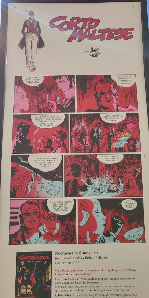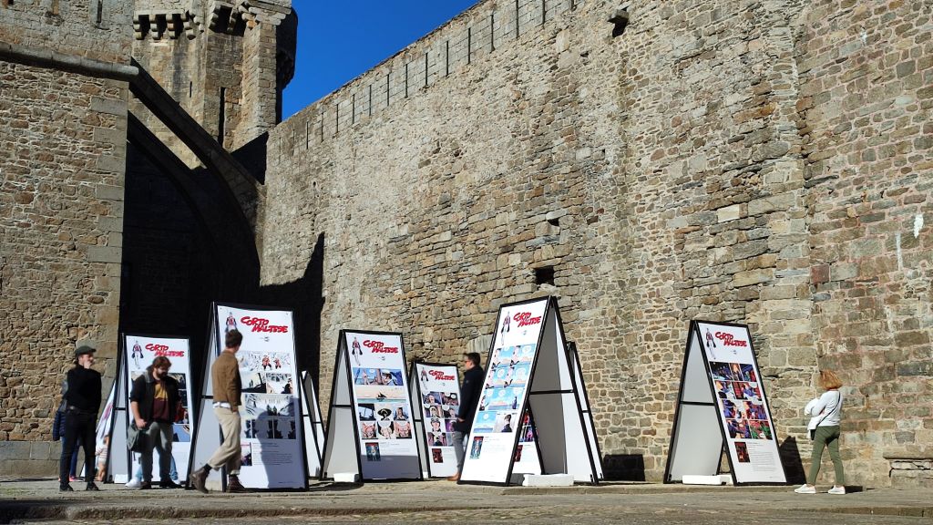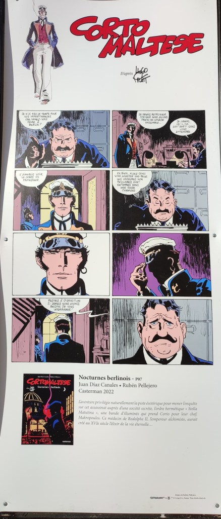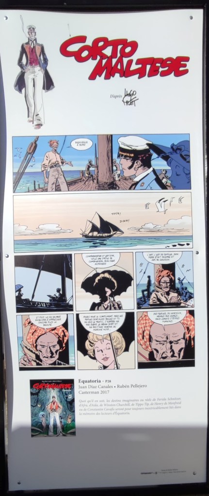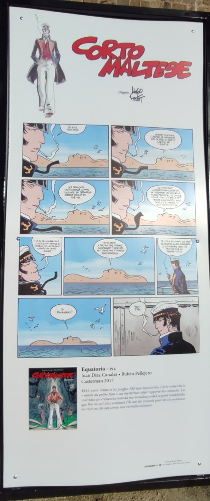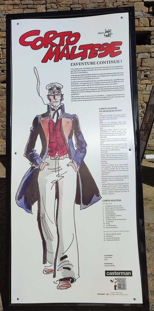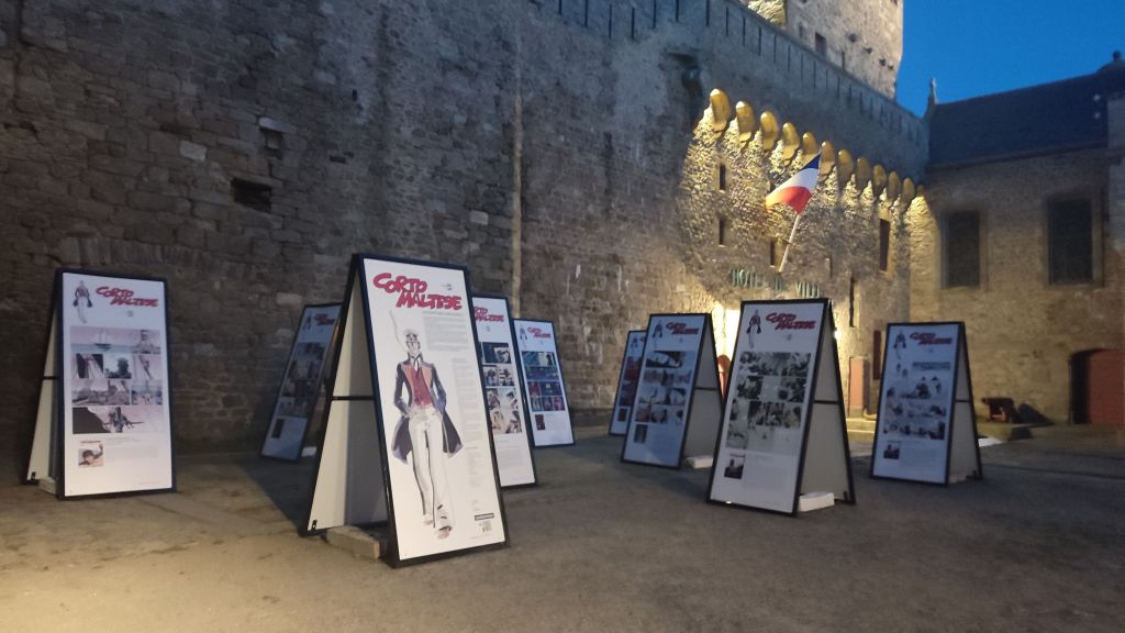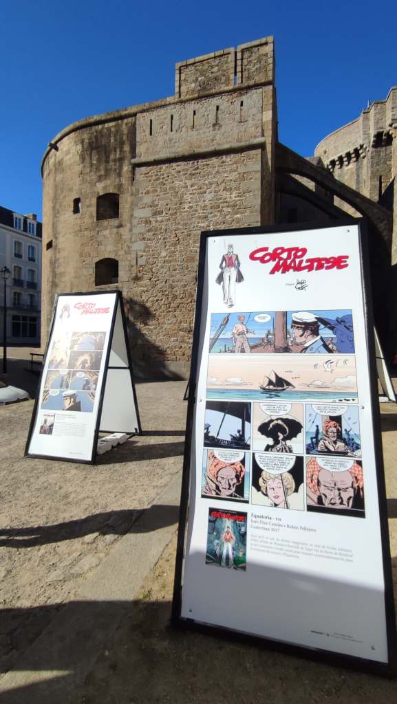 Corto Maltese l’énigmatique marin imaginé par Hugo Pratt est également de la partie à St Malo où il séjourne au pied de l’hôtel de ville grâce à des panneaux qui permettent aux passants d’admirer dans un cadre fantastique des reproductions de planches enthousiasmantes.