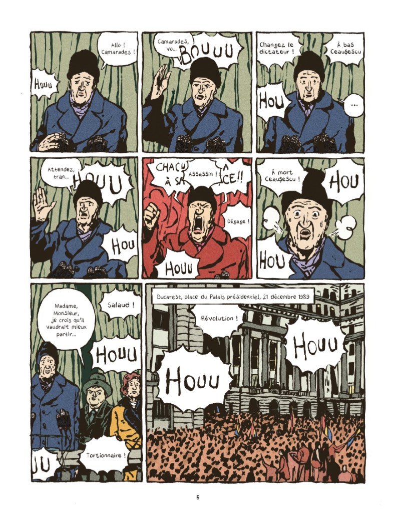 La mise en page est classique, la lecture linéaire aisée, le dessin de Gaël Henry juste et sans fioritures crée une ambiance souvent pesante. Le trait simple contraste parfois brutalement avec le propos humainement dense. La réalité dessinée est lourde, c’est à l’essentiel que l’on va. Concision des textes et sobriété des images s’accordent avec une colorisation efficace, signée Paul Bona, pour donner vie à cette galerie hétéroclite de personnages. Le choix des anecdotes, tragi-comiques, constituant le corps de leurs histoires est parfois même traité sans texte mais par une succession de vignettes carrées ; une forme austère pour un fond difficile frisant parfois avec l’absurde. Impossible de vous conter ce qui rapproche ces personnages sans trahir l’objet de cet « ours de Ceausescu » édité par Steinkis. C’est sur les dernières pages que la fiction et l’Histoire, celle avec le H majuscule, se rejoignent pour clore ce chapitre sombre de l’Histoire de la Roumanie.