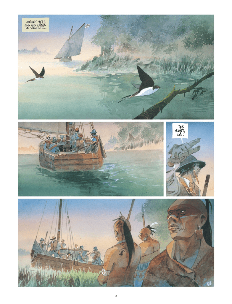 Après tant d’opus consacrés à cette passion et l’accumulation d’une colossale documentation, Pocahontas, la légende indienne résonnait un peu comme une évidence dans le parcours de l’aquarelliste. Il y a dedans tous les ingrédients pour séduire les amateurs d’une thématique appréciée et populaire : l’arrivée des Anglais, l’expédition en bateau, la construction d’un fort, une fine approche des Indiens, de leur mode de vie, de leur culture mais aussi des personnages bien bâtis, facilement identifiables que l’on a envie de suivre dans un récit qui s’étale sur plusieurs années.