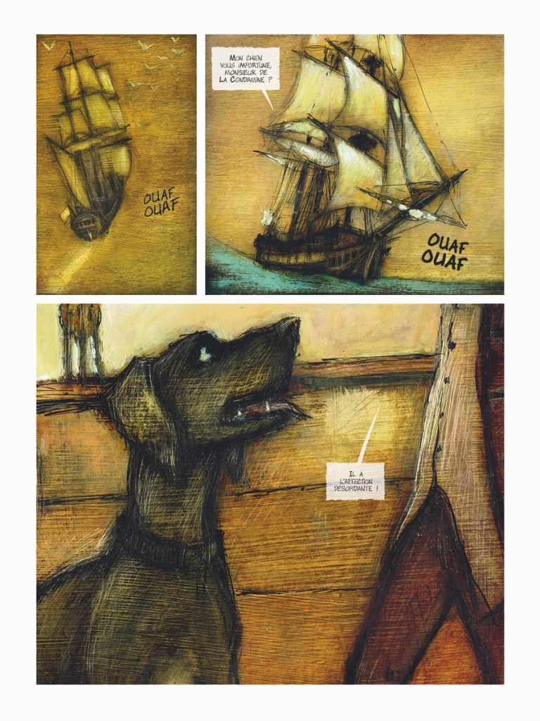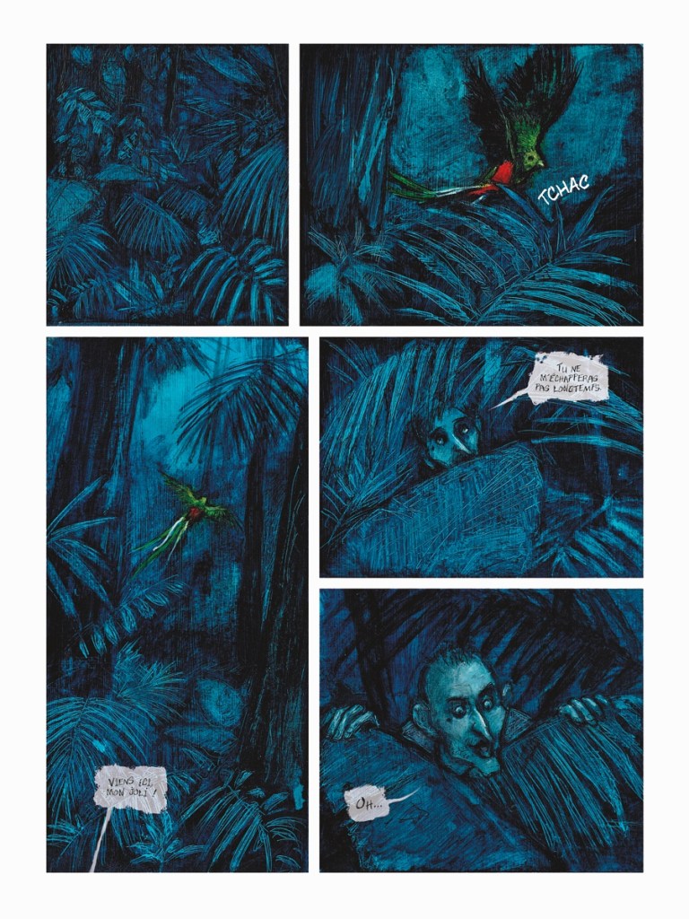 Une profonde palette de couleurs et de lumière se décline de planche en planche, traduisant l’ambiance exotique. A chaque page ses tonalités profondes et vibrantes. Les fonds sont structurés, composés de fines rayures, comme peintes sur du bois vieilli, donnant un caractère unique à l’ouvrage. Les traits noirs, fins, sont volontairement répétés, enveloppant les dessins en de fantomatiques silhouettes surgissant du passé. Les costumes, perruques et l’épais maquillage blanc contribuent au surréalisme de ces penseurs en prise avec la maladie, le climat, les montagnes… Et aussi les jolies femmes. Au contact des Indiens, ils découvrent une autre approche de la nature, tout aussi savante mais plus connectée, plus lumineuse.