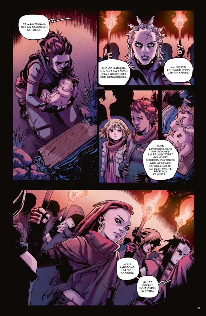 Ce premier tome s’ouvre sur une scène d’abandon rituel où une femme confie son nourrisson mâle et bien portant aux eaux vives d’une rivière ; on lui souhaite pour sa prochaine grossesse la naissance d’une fille… Le groupe rejoint ensuite le Thing, une forteresse érigée dans les ruines d’un parc d’attractions. Le décor est rapidement planté et plonge le lecteur dans une revisite post apocalyptique du mythe des Amazones. Ici, en 2077, un clan composé exclusivement de femmes résiste au Protectorat, dictature misogyne et phallocrate. Cependant des dissensions existent partout et bientôt l’intrigue s’étoffe autour de Kahina, personnage central et guerrière redoutable. Le scénario de Sylvain Runberg et Anna Saveg nous emmène rapidement bien plus loin que la simple dichotomie « femme versus homme » et interroge les rapports entre les individus, développe tout un panel de personnages secondaires. Tala, adolescente, cherche un lien radiophonique avec d’autres groupes humains potentiellement disséminés à la surface de la planète. Ishta, enceinte, refuse de risquer de devoir abandonner son bébé si c’est un garçon. Sigrid, chef du clan, est amenée à prendre des décisions difficiles… Au fil du récit, on remonte aux origines du Mal de ce monde : le déclenchement d’une guerre nucléaire sans précédent par une femme ; dès lors, la règle devient de toutes les empêcher de « nuire » en les réduisant à l’esclavage. La fuite et la résistance deviennent alors les seules alternatives possibles…