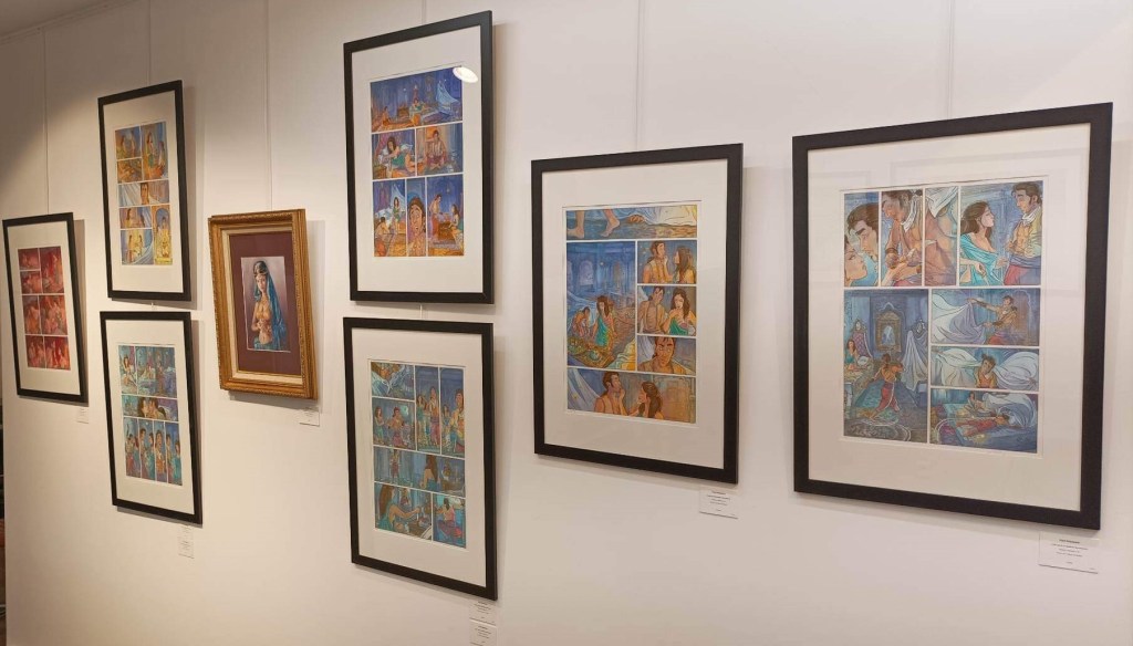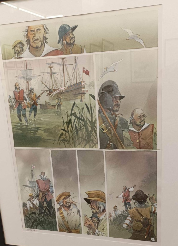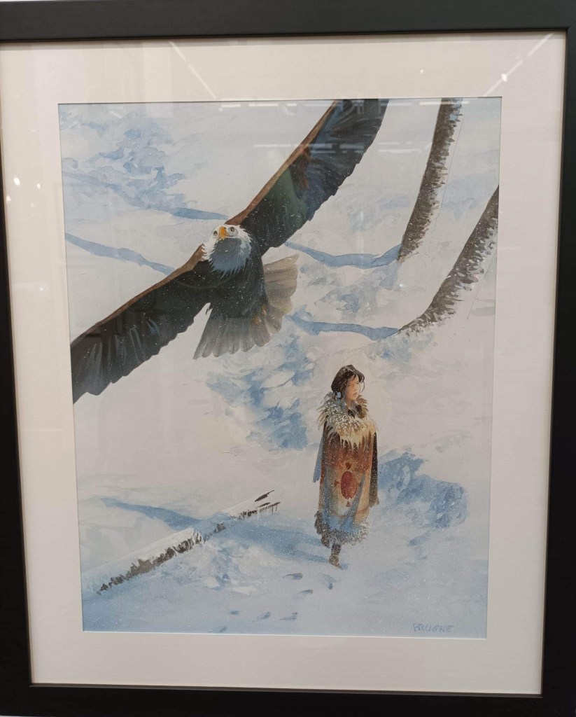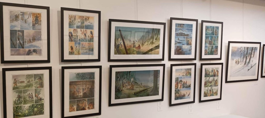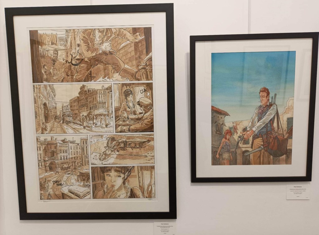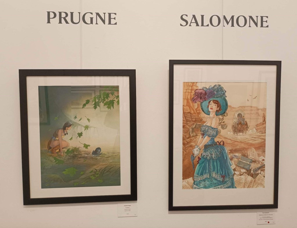 C’est dans ce cadre magnifique situé au 36 rue du Louvre à Paris que Patrick Prugne et Bruno Salomone étaient à l’honneur. Le premier avec son sublime one shot intitulé Pocahontas dans lequel il narre l’histoire vraie et romancée de la fameuse princesse indienne et le second avec ses compositions réalisées pour Celle qui fit le bonheur des insectes avec Zidrou au scénario.  C’était aussi l’occasion de contempler quelques planches issues de la série à succès « L’homme qui n’aimait pas les armes à feu » un western spaghetti paru chez Delcourt pour lequel il collabora avec Wilfrid Lupano.