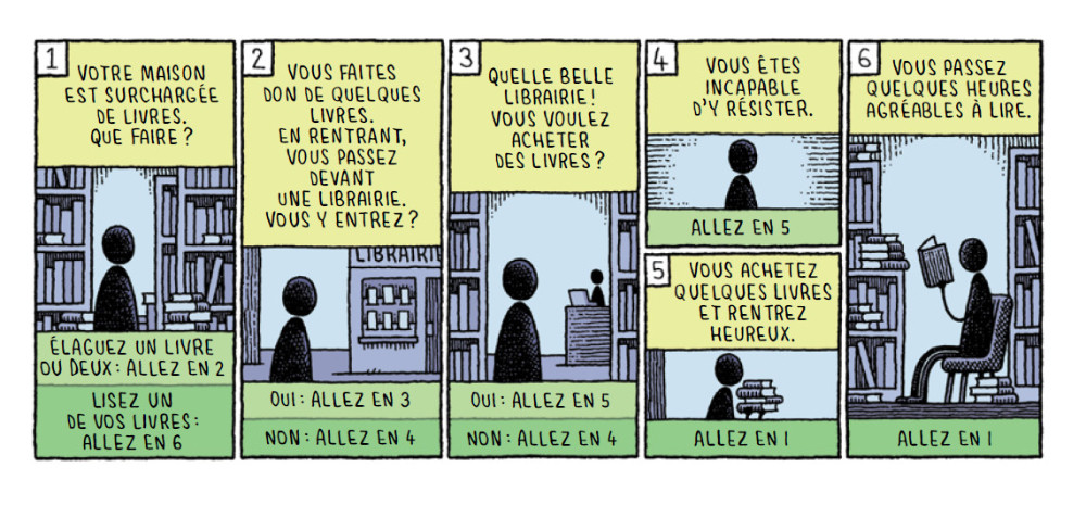 Chaque planche donc, en dessin unique ou en suite de vignettes, se suffit à elle-même et traite d’un point choisi par l’auteur : parodie de titres de livres, vie quotidienne d’un écrivain, processus créatif d’écriture, comportement du lecteur compulsif, générateur drolatique d’idées… autant de thèmes qui ont sacrément amusé l’amoureuse des livres que je suis.