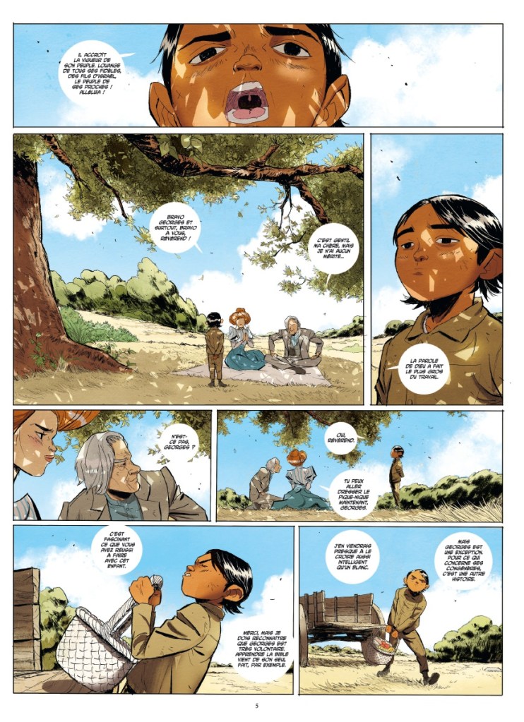 Neyef nous offre avec Hoka Hey, aux éditions Rue de Sèvres dans la collection Label 619, une bande dessinée de toute beauté. L’objet en lui-même en impose au premier coup d’œil. Il est apprêté d’une couverture cartonnée au dos toilé. Le papier est de grande qualité et l’impression mate lui donne une grande classe. L’illustration qui orne ce one-shot nous harponne forcément grâce au regard incisif de Little Knife, notre héros. Mais avant de le rencontrer, nous allons faire la connaissance de Georges.