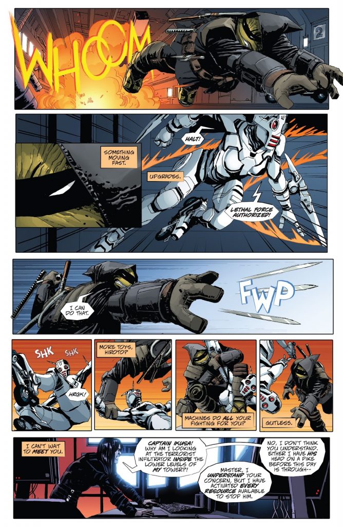 Pourtant un combattant portant une carapace solide comme armure et élevé dans les préceptes du bushido, s’introduit à l’intérieur de la métropole. Il fait une percée fracassante parmi les lignes ennemies. A lui seul, il neutralise autant d’adversaires qu’un preux chevalier ne pourrait l’imaginer. Ce guerrier est l’ultime représentant de son espèce mutante, il est hanté par des fantômes et porte un bandeau noir pour marquer le deuil de ses trois frères et la perte de tant d’autres.
