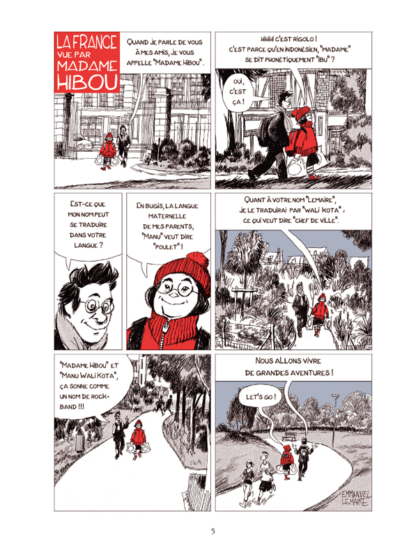 L’auteur appelle sa voisine Madame Hibou, parce qu’en indonésien, Madame se dit phonétiquement « Ibu ». De page en page, elle nous parle de la vie des expatriés, mais aussi de celle des célibataires dont elle fait partie. Elle décortique les petites bizarreries des Français, offre une prise de recul sur ce qui peut les faire râler : grâce à ses explications, nous nous rendons compte que les manifestations chez nous sont très pacifiques et bon enfant, ou encore que sortir sous la pluie, ici, c’est toujours possible ! Elle raconte son pays, les coutumes culinaires qui tiennent une place importante dans sa vie, les traditions, les superstitions… Elle nous parle aussi des préjugés sur les personnes d’origine asiatique, mais surtout de solidarité et de chaleur humaine, avec les bons moments partagés, les plats sous le palier quand le voisin est malade, le soutien en période de deuil… Avec elle, la visite de l’Hexagone se poursuit, la gourmandise étant autant moteur de sa motivation que la curiosité et la soif de découvertes. Elle nous invite à prendre le temps de partager un café, de discuter… Et la complicité entre l’auteur et Madame Iriani ne se dément pas.