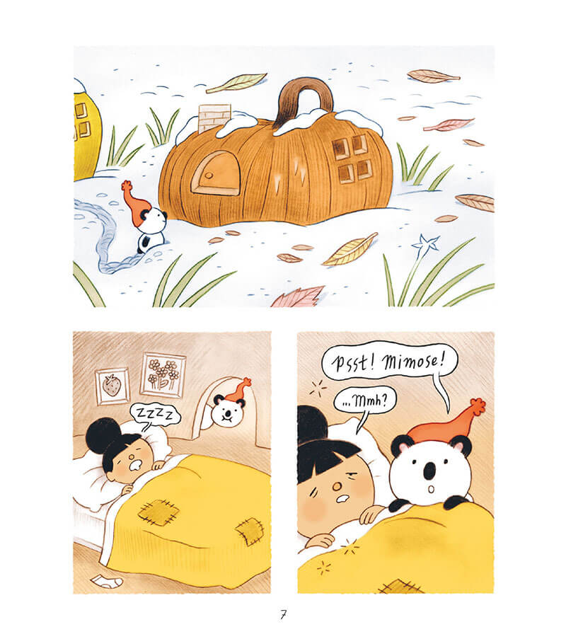 Quand il refait surface les éléments se sont déchaînés. Les bourrasques de flocon l’obligent à se mettre à l’abri. Bien au chaud dans une grotte il attend que ça passe, toute en réfléchissant à l’endroit où il pourra trouver le dernier élément. A l’autre bout du verger, Mimose commence à s’inquiéter de l’absence de son comparse… Il faudra attendre la fin des intempéries pour savoir si Sam arrivera à retrouver le chemin de chez lui et à déguster ses tartines !