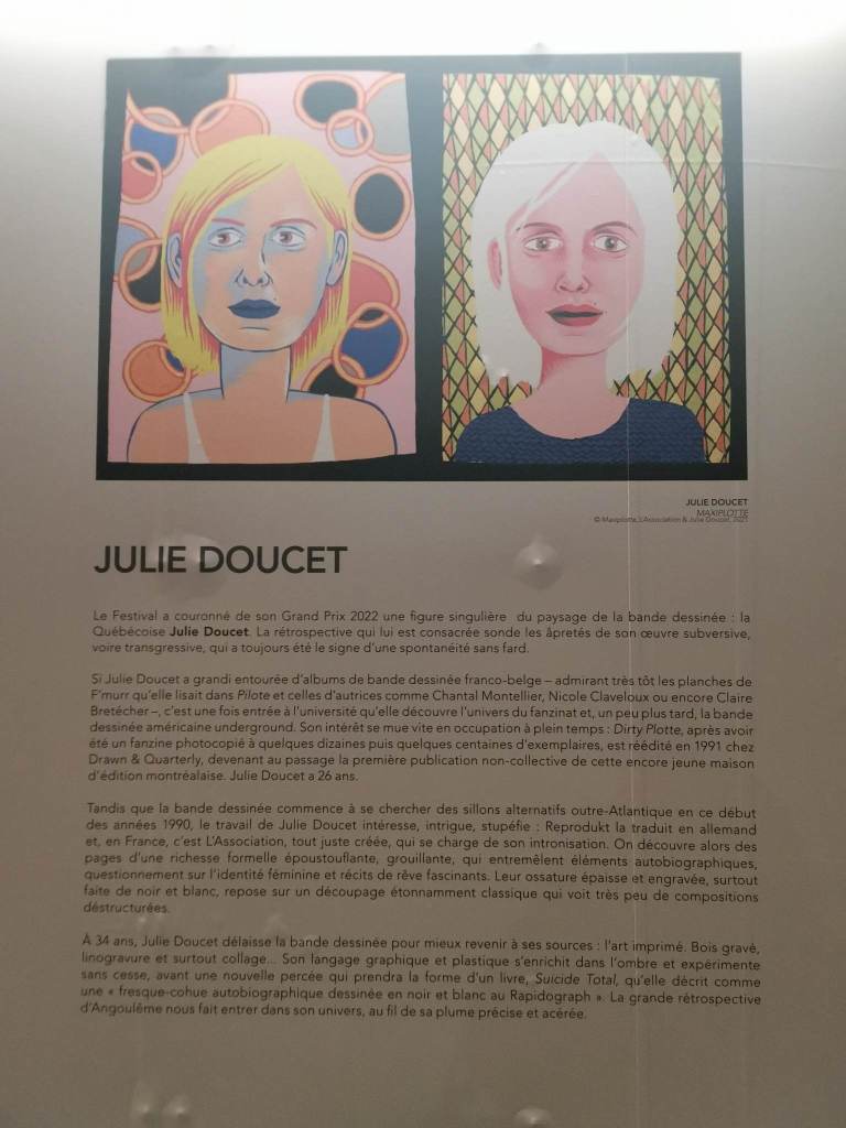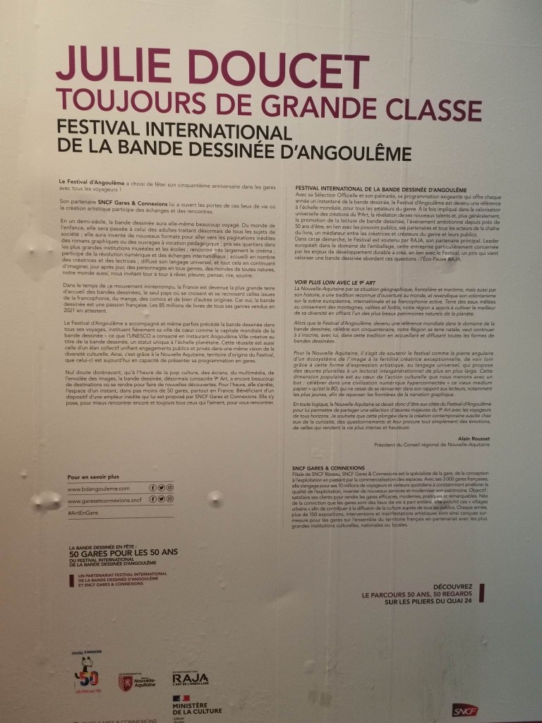 Afin de faire connaître au plus grand nombre l’œuvre de la Québécoise Julie Doucet, lauréate du grand prix de la 49ème édition du FIBD, le Festival International de la Bande Dessinée d’Angoulême et son partenaire SNCF Gares & Connexions ont installé dans la gare de Paris Austerlitz des panneaux qui permettent de partir à la rencontre d’une artiste unique.