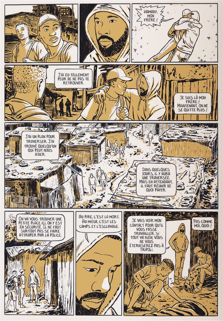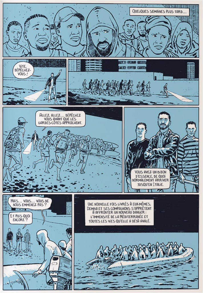 Nahja et Hiba sont une mère et sa petite fille, fuyant la guerre et cherchant à se réunir avec le père, arrivé plus tôt en France. Demba et Djibril quittent la misère et la répression contre les revendications sociales des Peuls. Si les motifs de départs sont nombreux, le danger du parcours est toujours présent. Des passeurs criminels abandonnent des groupes sur des navires percés, ou en plein désert, sans eau, quand ils n’abattent pas carrément leurs victimes. La traversée de la Méditerranée est une souffrance sans nom alors que la plupart des personnes tentant la traversée ne savent pas nager. L’Union Européenne et les États veulent contrôler leurs frontières, quitte à procéder à un tri très sévère ramenant de nombreuses personnes à la mort. L’attente est interminable, dans des conditions inhumaines. Ou alors certains tentent la traversée des Alpes, éprouvante. Sans parler du passage vers l’Angleterre. Et puis la guerre en Ukraine a créé des inégalités de traitement, qui interrogent. Suis-je moins Humain si j’ai la peau noire, ou si je ne suis pas catholique ? N’ai-je pas les mêmes droits ? Ma guerre est-elle moins inhumaine qu’une autre ? Quelle est la valeur de ma vie ? Les soutiens sont rares, mais précieux, des volontaires aux professionnels, de l’entraide au sacrifice.