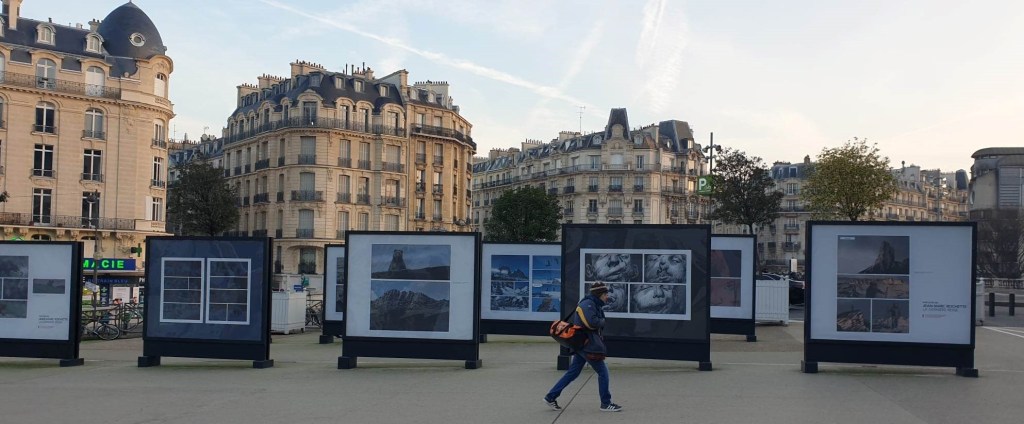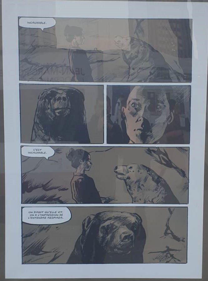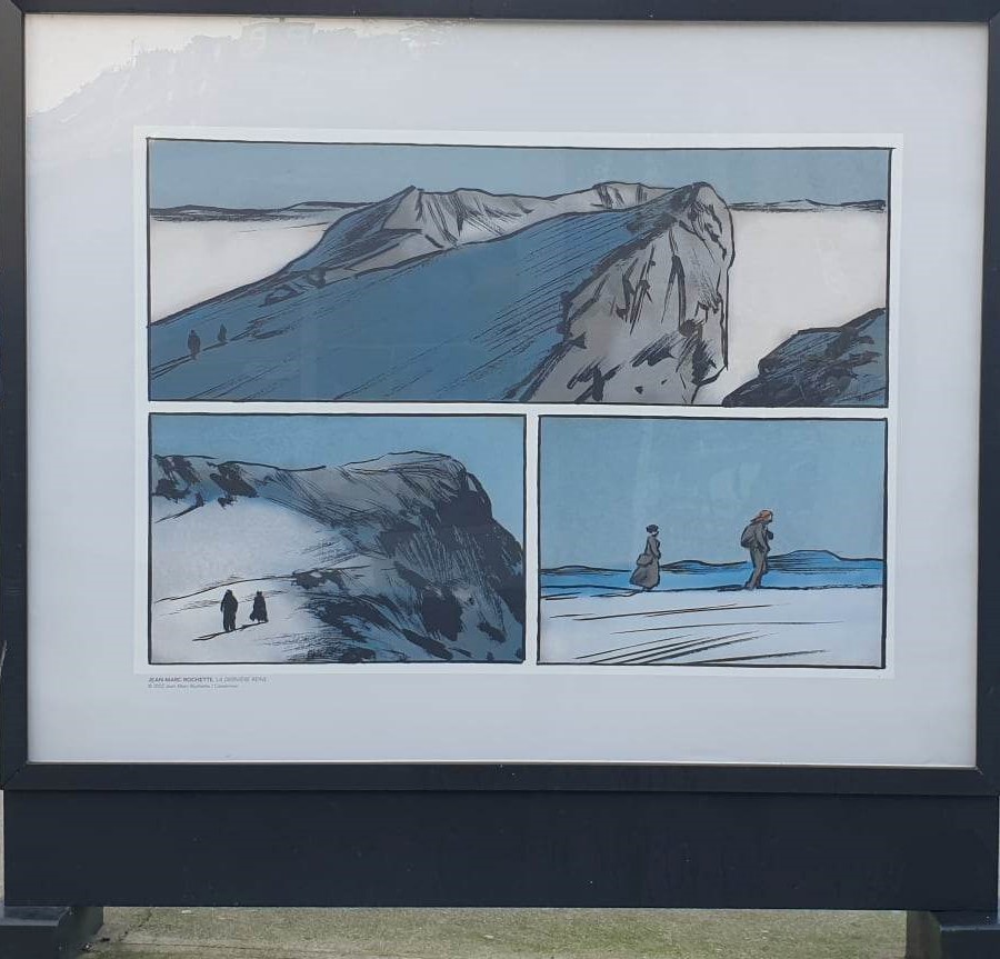 A Paris, de grands panneaux abritent des planches agrandies pour l’occasion. Ils permettent d’apprécier la technique traditionnelle d’un bédéiste qui est également peintre et sculpteur. Il est l’artiste de la montagne, celui qui nous bluffe et nous émeut systématiquement par sa représentation d’une nature splendide et hostile qu’il connaît parfaitement.