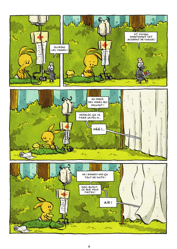 Dans une forêt où tout semble paisible, des animaux attendent leur tour pour se faire soigner par le médecin. Il y a des bobos sans grande importance, ainsi que des maladies plus graves. Lapin, n’est pas très rassuré quand il voit le soignant dérouler la longue liste de médicaments qu’il va devoir ingurgiter. Loup quant à lui, ne trouve pas très plaisant la manière dont l’infirmier veut procéder à sa prise de sang. Le canidé furibard éjecte le soigneur et croise le regard du rongeur perfusé. Tout tremblant face aux crocs effrayants, Lapin imagine que sa dernière heure vient de sonner. Ils sont dérangés par un ramdam tonitruant et voient défiler dans tous les sens les habitants du bois. Giboyés par des chasseurs, il est temps pour nos patients de prendre la fuite. Le canis lupus qui a bon fond manifestement ne peut abandonner le rongeur affublé de son goutte à goutte. N’écoutant que sa raison, il emporte sous son bras le léporidé et lui propose de rester à ses côtés tant que durera sa thérapie. Il ne s’attendait pas à ce que cela soit si long. Le moribond en a pour cinq mois. Quand on donne sa parole, on ne la reprend pas, les voilà donc dans le même bateau, je dirais même mieux, sur la même moto. Commence un road trip infernal qui mènera nos deux lascars sur la route et vers une franche amitié.