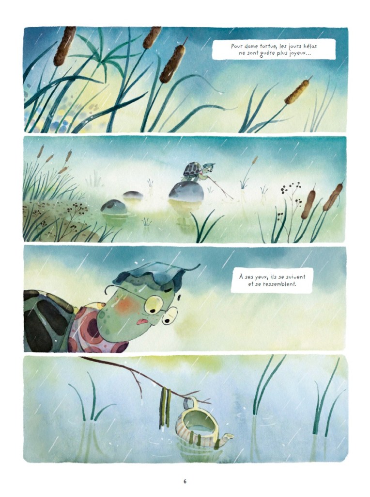 Dans ce charmant premier volet intitulé L’étincelle, on fait la connaissance d’une tortue qui souffre de la peur de l’obscurité ce qui lui pourrit la vie. Au fil de la journée, la tension grimpe tant elle appréhende la nuit. Tout s’arrange lorsqu’ elle rencontre un insecte sympathique Mirko, une luciole intrépide et positive qui l’écoutera et l’aidera à trouver une solution à ses problèmes.