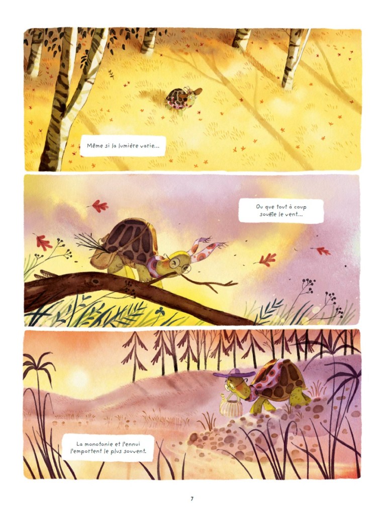 Il y a ensuite des mots bien choisis, discrets qui s’effacent devant de splendides images. Il y également de la malice dans le découpage avec de nombreuses cases horizontales, des pleines pages et doubles pages inspirantes, et puis des gaufriers parfois classiques ou plus recherchés et des pages de garde qui servent de cadre spatial à une aventure délicieuse. Les phylactères sont toujours disposés avec finesse.
