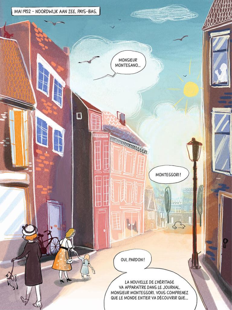 Plutôt qu’un récit biographique linéaire, l’histoire démarre lorsqu’une petite fille découvre, ravie, une maison des enfants. Et, à notre surprise, cette petite fille, c’est Anne Franck. Ainsi, nous sommes d’abord immergés dans le quotidien des lieux, où les enfants s’activent librement avec les plantes et outils pédagogiques à leur disposition. Puis Maria Montessori rend visite à ces enfants, et leur raconte son histoire… Qui est aussi la leur. Née en 1870, excellente élève, elle entre en faculté de médecine contre l’avis de son père, et devient l’une des premières femmes médecin en Italie. A partir de 1896, elle bouleverse le quotidien d’enfants internés, leur donnant accès aux jeux puis à une scolarité. En 1898, enceinte, elle est poussée par sa mère à continuer sa carrière, et c’est un grand déchirement pour elle de laisser son enfant à un orphelinat. Elle le retrouve des années plus tard, il créera avec elle une association Montessori internationale, et il la suivra dans ses voyages. Les batailles intérieures de notre héroïne rejaillissent sur celles qu’elle mène à l’international, jusqu’en Inde où les pratiques culturelles l’influenceront grandement.