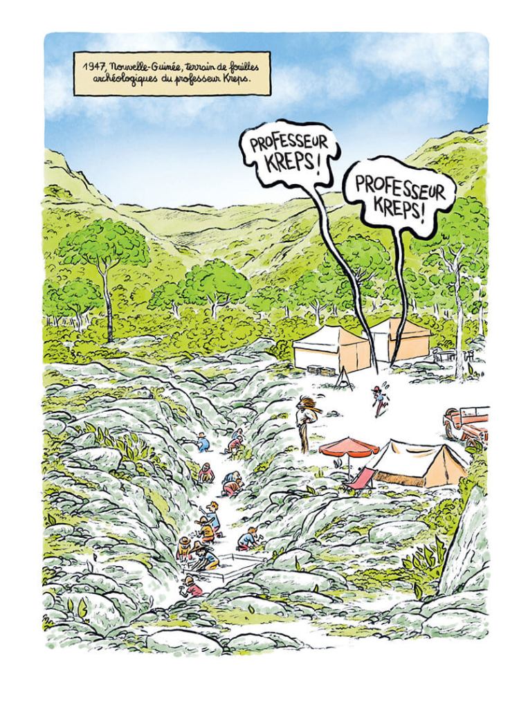 Tout commence lorsqu’une équipe de paléontologue découvre un os très intriguant, aux caractéristiques mi-singe, mi-Homme ! Pendant ce temps, Douglas Templemore, journaliste anglais, vient de tomber amoureux de la belle écrivaine Frances… Mais le voilà embarqué en Nouvelle-Guinée, pour rédiger le journal intime de l’expédition. Les paléontologues ne manquent pas de personnalité : Le Professeur Kreps, qui dirige les travaux, fonce dans la jungle comme un rhinocéros et aime faire montre de son savoir scientifique. Le vieux Greame est doux et sage, sa jeune femme Sybil froide mais perspicace. Elle et Douglas entament un dialogue argumenté, relayé et approfondi dans les lettres à Frances : les Manus sont-ils singes ou hommes ? L’équipe va de découverte en découverte : des singes qui taillent leur silex, vivent non pas près des arbres mais dans des falaises, ont aménagé une nécropole funéraire, fument leur viande ! Ils finissent par les approcher… Des liens se nouent et les questions continuent : à partir de combien de sons peut-on parler de langage ? Les Manus ont-ils de l’humour ? Des rituels symboliques ?