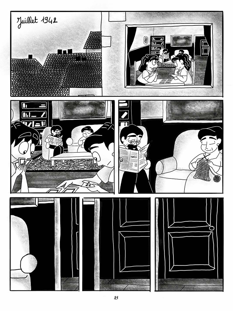 Chaque chapitre plante le décor, en une double page sommaire mais explicite. Les cases nous immergent ensuite à hauteur d’homme – nous rappelant que tout cela est bien réel, a bien eu lieu. Le dessin rond et naïf en début de livre peut surprendre. Mais le style correspond bien à l’état d’esprit de la jeune Ginette, adolescente gourmande : la vie est belle malgré tout, la famille grande, joyeuse, et pleine de ressources, et la France la protège. Le contraste est saisissant quand le rideau tombe : le dessin se fait anguleux comme les corps des prisonniers, les cris des kapos tranchants et leurs gestes violents. Le blanc laisse place à l’obscurité. Les groupes deviennent des pions noirs – des matricules. La jeune auteure réussit à transmettre beaucoup d’émotions à travers les regards des personnages, inquiets, tétanisés, anéantis. Déshumanisés, ils n’ont même plus de visage… Et le récit se fait silence lorsque les mots ne suffisent plus… Au dernier chapitre, le temps fait son œuvre, la vie se déroule en quelques planches touchantes, jusqu’à ce que naisse, finalement, le besoin de parler.