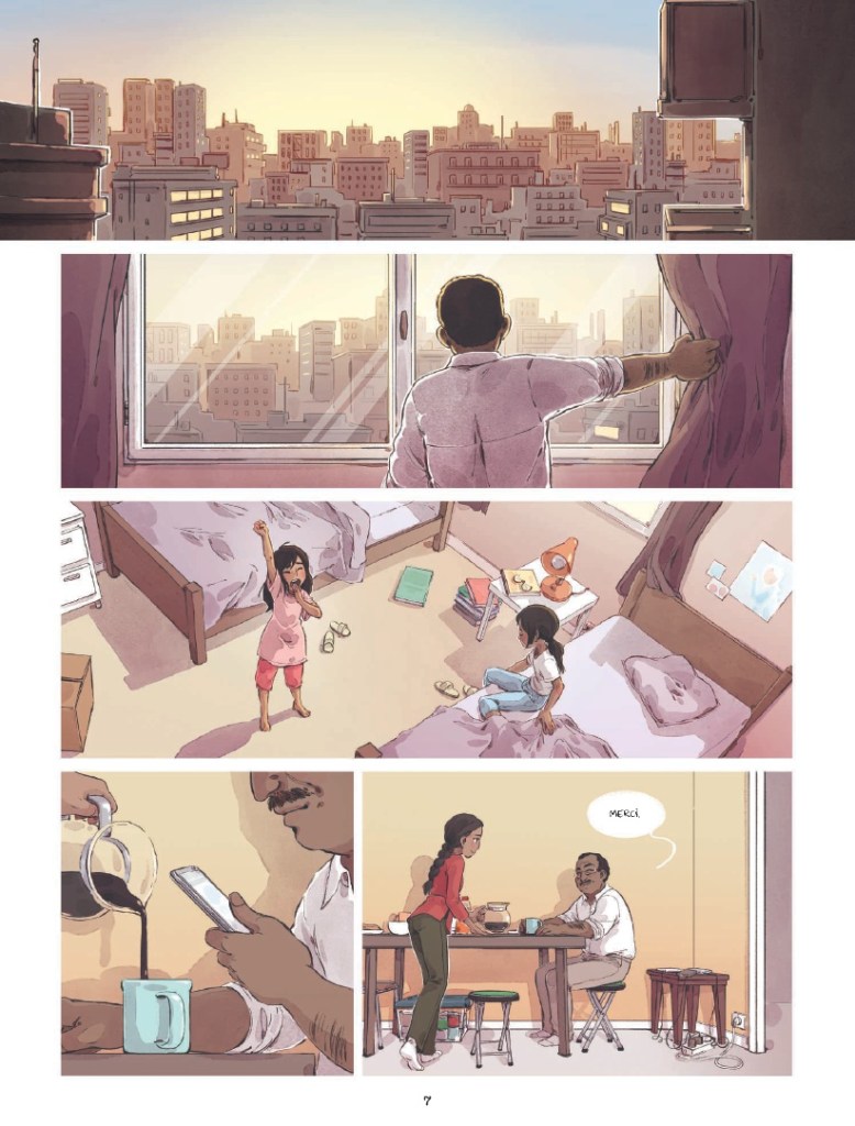 La structuration du récit alterne le quotidien de la famille d’Ahmad, qui pourrait être le nôtre, et le cauchemar grandissant pour Zéré, dont la vie a au contraire basculé. On aime les visages arrondis et les yeux grandis des filles, la gaieté naturelle des enfants, qui nous rappellent leur innocence. L’émotion est palpable et renforcée par les visages en gros plans. Incompréhension de la communauté. Cynisme de certains kidnappeurs. Terreur de l’enlèvement, pour la victime comme pour les proches, que les sanglots submergent par moment malgré leur tentative de continuer à vivre normalement. Et le soulagement, enfin. La coloration, aboutie, offre de délicates nuances, mettant en valeur les jolis yeux bleus des filles, mais aussi les larmes sur les peaux mates. Les tons chauds et lumineux du début de l’histoire laissent petit à petit place à des couleurs plus froides et plus sombres, sans que soit oublié le soin du détail dans le traitement des décors et paysages : Scène d’appartement, dans la ville, à la montagne ou en prison, de jour comme de nuit. Le découpage travaillé soigne les jeux de regards : on est conquis par la détermination, le courage et la tendresse des personnes, qui ont su garder également un peu de malice.