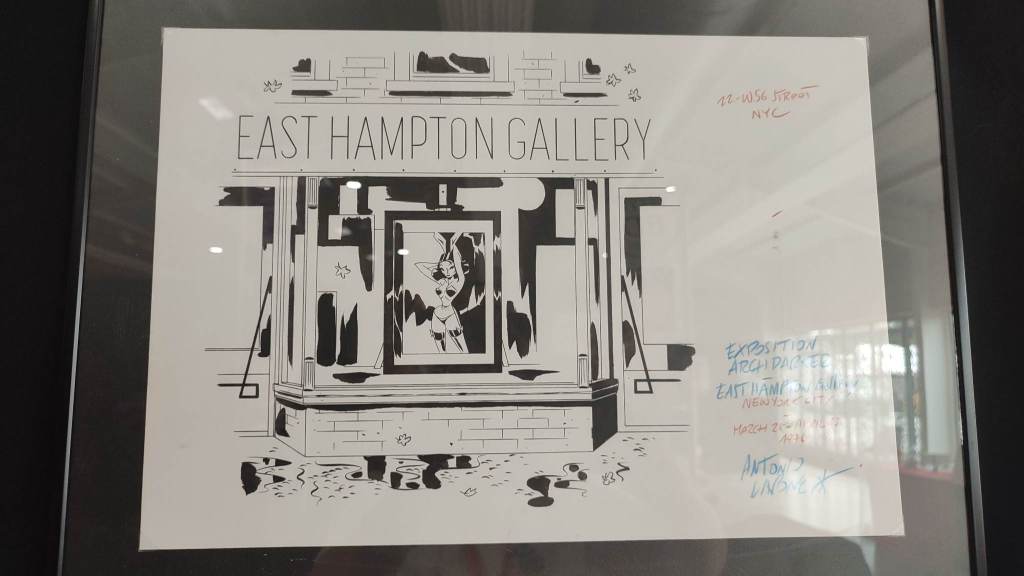 Grâce à une scénographie intelligente, on pouvait entrevoir le modus operandi d’un artiste dont les compétences dépassent largement le cadre de la bande dessinée comme le témoigne son affiche spécialement réalisée pour l’événement. Il sait tirer profit de ses diverses expériences professionnelles antérieures pour se démarquer et attirer le regard du spectateur où il le désire.