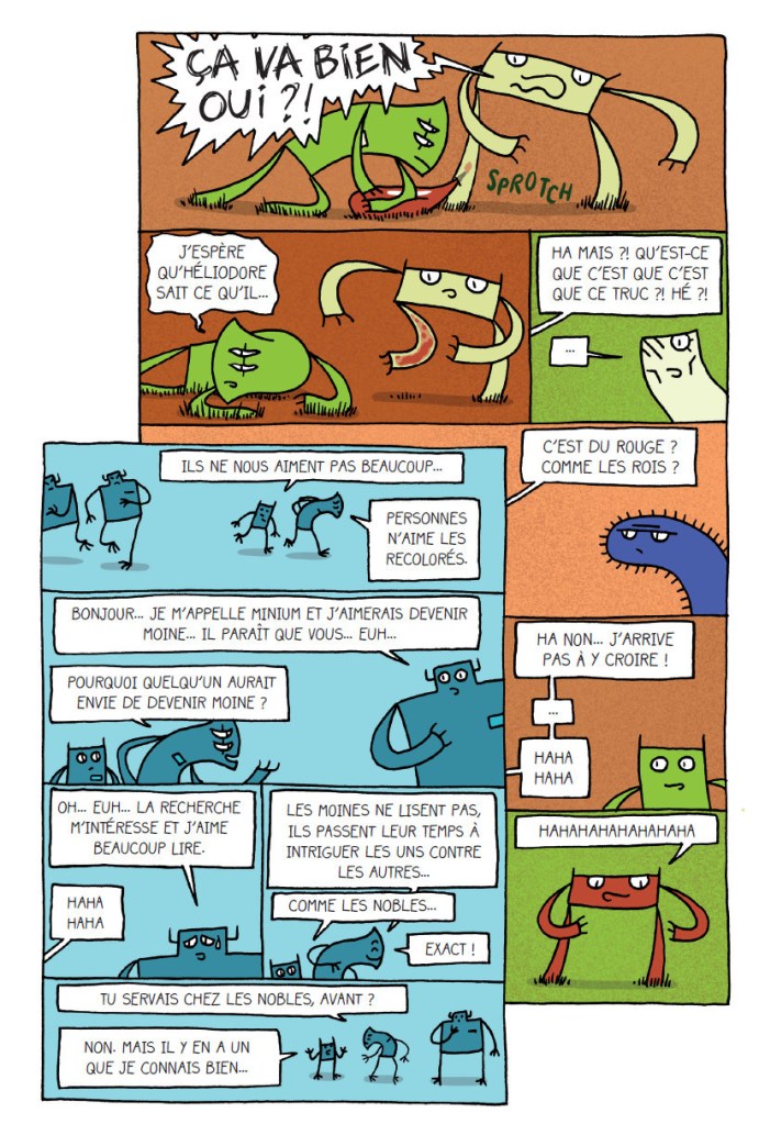Le titre, les pigments sauvages intrigue d’emblée. Et nous voilà subjugués par la couverture noire, où une matrice bleue à motifs rayés, ondulante, observe de ses multiples yeux trois créatures. Carrées, vertes, à pattes de Shadok, elles semblent fuir… Oui, vous l’aurez deviné, cette BD, aux éditions The Hoochie Coochie, est absolument renversante, innovante, géniale ! Plongez-vous dans cette saga rythmée et philosophique, au découpage incroyable. Les dialogues, modernes et croustillants, sont dignes des Monty Python. Décalés et nourris d’autodérision, ils s’accordent parfaitement aux dessins brillamment minimalistes, stylisés et harmonieux. Alex Chauvel, influencé par exemple par Lewis Trondheim, nous propose son univers microscopique et fantastique, composé de lémures parasites, sous forme de colonie hiérarchisée avec nobles, troupes, ondines esclaves en gestation, domestiques, ordre des pigmenteurs… Mais ce petit monde est au bord de l’effondrement. Si l’épopée a des airs de « Game of thrones », sur fond de successeurs, manigances, trahison, armes secrètes, et recherche de liberté, les mythes fondateurs ne sont pas loin…