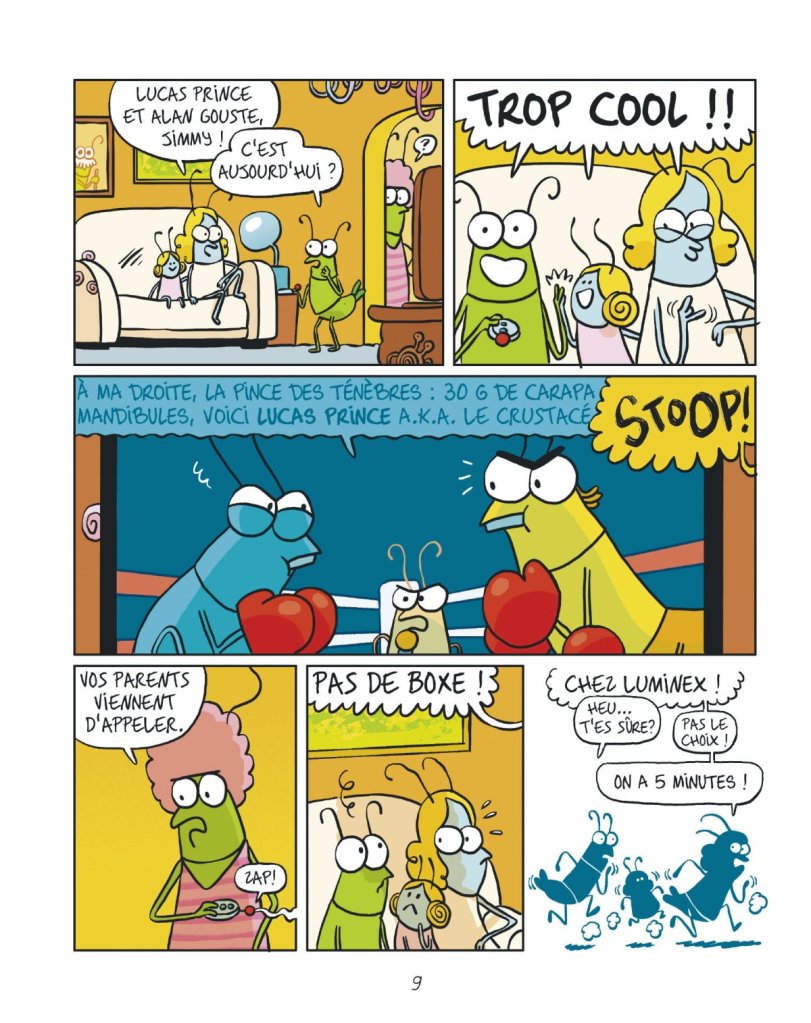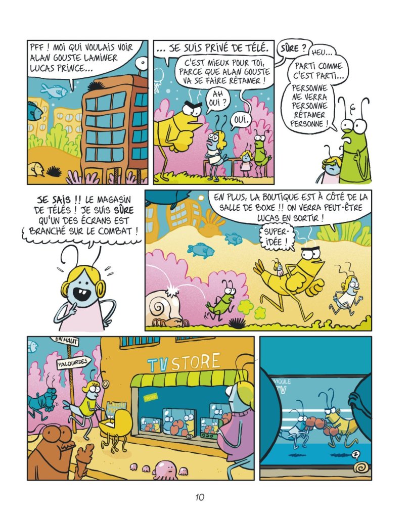 Youpi, c’est les vacances ! Bientôt la plage pour les chanceux, coquillages et crustacés… Vous avez dit crustacés ? Connaissez-vous Simone, l’héroïne à contre-courant ? Bd kids nous régale d’une petite crevette invisible. Mais quelle idée a eu la scénariste Anne Schmauch de nous servir ce minuscule personnage ? Détrompez-vous, comme le titre de cette bd jeunesse l’indique, Simone se bastonne ! Non seulement elle est prête à en découdre, mais en plus, avec elle et sa bande, l’humour est au rendez-vous. Guillaume Long nous offre des dessins décalés à souhait, couleurs peps et mimiques aux yeux irrésistibles ! Les préados (8-10 ans) apprécieront le vocabulaire, riche et familier. Une première version de cet album avait obtenu le prix du petit libraire en 2021. Dans la team de Simone, présentée en introduction, il y a sa mignonne petite soeur, Sibylle ; son meilleur ami Jimmy Krill, un peu trouillard, jamais sans son encyclopédie, et César Luminex, qui fanfaronne en brillant la nuit. Notre héroïne, pleine d’énergie, n’hésite pas à affronter bien plus grand qu’elle : de la dame de la cantine aux murènes et méduses. Bob l’éponge peut se rhabiller ! Gags originaux et répartie garantissent des dialogues croustillants. La couverture rouge corail donne le ton : les couleurs sont à la fois résolument vives et maritimes ! Craquez pour les crevettes bleues, yeux globuleux et perruque blonde, souriez des moustaches du père ou de l’allure de Jimmy Krill, qui n’est pas sans rappeler Jiminy Cricket, tremblez face à la murène violette ! Et plongez l’air de rien pour une sympathique découverte du monde marin, du môle à la raie manta. L’école sous l’eau est propice à bien des situations incongrues. Onomatopées de rigueur, ça fait blam, bling, sblaf! De Simone Veil à Simone de Beauvoir, les Simone sont des femmes fortes et des sources d’inspiration. Un joli clin d’œil pour une BD tout public, détente, agréable, drôle… Et facile à prendre dans le train par son format réduit !