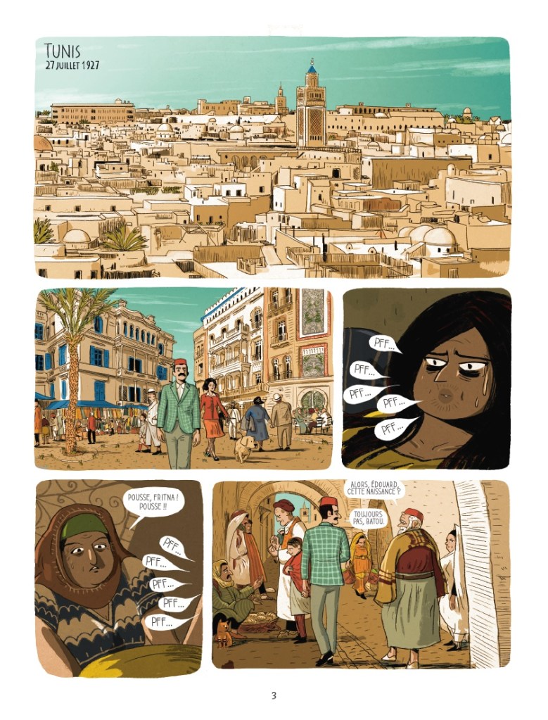 Derrière un trait assez rond, chaque case révèle des détails minutieusement choisis : un vêtement, un décor, un paysage… Les couleurs sont au rendez-vous, avec un fil conducteur composé de couleurs miel et turquoise traduisant à merveille l’ambiance tunisienne. Chaque case est imprégnée de motifs évocateurs, de l’architecture mauresque à l’oranger dans la cour, des coiffes aux tuniques, des bâtiments coloniaux aux palmiers les encadrants… La curiosité de Gisèle nous emmène en visite au Bardo, grand musée de Tunis, ou à la découverte de ruines ; les vacances sont l’occasion de belles vues sur le port de la goulette. Mais l’enfance de notre héroïne n’est pas idyllique, ses regards noirs et ses pleurs en disent long sur son combat permanent. L’angoisse de certaines nuits, pour notre jeune rebelle, n’est pas oubliée lorsque les planches se font bleu nuit. Mais complicité et combativité sont aussi souvent au rendez-vous.