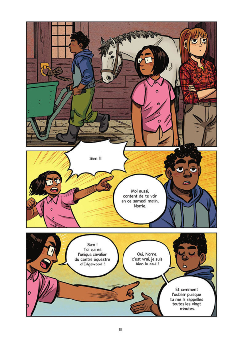 Norrie, Hazel et Sam aiment passer du temps à l’humble centre équestre d’Edgewood. Norrie, très impliquée, voit d’abord l’arrivée de Victoria comme une menace. Il faut dire que la nouvelle réagit froidement à son accueil… Si Victoria garde ses distances, c’est qu’elle a été blessée par son amie de longue date : compétitive, Taylor a maintenant un cheval à elle… Mais elle a refusé que Victoria le monte et n’a pas compris son désir de passer du temps tranquillement avec les chevaux. Objet d’une pression pas toujours bienveillante à l’écurie Waverly, notre protagoniste a préféré en changer pour un centre plus modeste. A Edgewwod, elle reçoit non seulement la confiance des adultes, mais également l’intérêt des jeunes, dés lors qu’elle propose coopération plutôt que concurrence, pour s’occuper ensemble d’un nouveau cheval à dresser. La découverte d’une passion commune pour la série de science-fiction « Beyond the Galaxy » avec les autres achèvera de briser la glace. A la clé, un bel épanouissement et un happy end agréable.