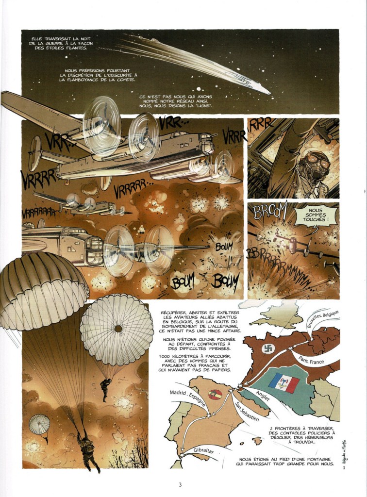 Il y a 70 ans, l’Europe avait le souffle coupé, victime du fascisme, en plein cœur de la Seconde Guerre Mondiale. Heureusement, en France comme ailleurs, la résistance s’était organisée en une multitude de groupes, avec une portée internationale. Une organisation, en particulier, qui aidait les pilotes alliés, s’est avérée décisive. Des décennies plus tard, la dernière survivante, Christiane Saldias, témoigne dans une bande dessinée soignée intitulée Le réseau comète – La ligne d’évasion des pilotes alliés . Grand Angle a réuni une brillante équipe, très complète, pour rendre hommage à ces héros : Jean Yves le Naour au scénario, Marko au story-board, Iñaki Holgado aux dessins, Aretha Battistutta à la couleur. Et si l’histoire est forcément sombre et les victimes nombreuses, ne craignez pas un récit déprimant. C’est autour de la préparation d’un plat basque, l’axoa, que l’histoire nous est contée, apportant douceur et résilience à ce témoignage inspirant, qui offre également quelques pointes de malice à la hauteur des actions effectuées au nez et à la barbe des ennemis. Un résultat réussi, qui vaut le détour, dès 10 ans ; avec en prime 8 pages documentées en fin d’ouvrage permettant grâce aux photographies, précieuses, de mettre des visages sur des noms.