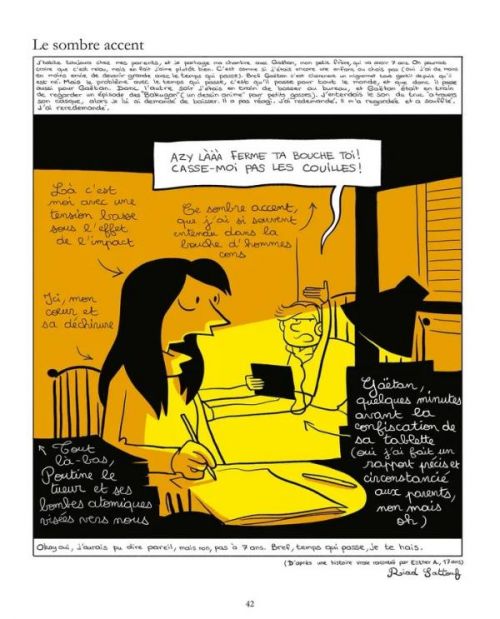 Certains aborderont cette BD avec nostalgie – 17 ans, c’est le bel âge. D’autres, à la façon, d’Esther la liront en mode « ouaich, c’est trop vraie cette scène, il m’est arrivé la même », d’autres encore découvriront certaines facettes du monde adolescent : tester les limites, réaliser ses premières expériences professionnelles (et faire des erreurs, parce qu’on apprend encore), se poser des questions sur son avenir et sa vie amoureuse… Quoi qu’il arrive, franchement, vous ne ferez qu’une bouchée de cet album, où les chroniques hebdomadaires se transforment en une intrigue prenante… Sauf à s’attarder sur certaines cases – l’auteur ayant ce don de réaliser des dessins iconiques qu’on aime accrocher sur un mur, et de proposer des petites phrases qui font mouche. Et si votre rentrée ne s’est pas passée comme vous l’avez imaginé, rassurez-vous, vous verrez en dernière page que vous n’êtes pas les seuls – mais vous pourrez retourner à la page consacrée à une relaxation mentale, pour prolonger un peu les vacances à la plage. Merci Esther ! Et merci Riad Sattouf !