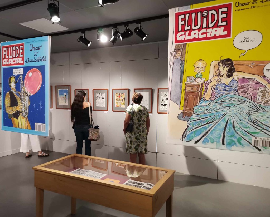A travers les couvertures de Fluide Glacial et les planches présentées, on est frappé par la capacité à manier aussi bien le noir et blanc que des couleurs explosives – comme cette bulle de malabar géante débordant d’un saxophone. Les dialogues sont croustillants, les scènes cocasses, les hommes souvent remis à leur place.