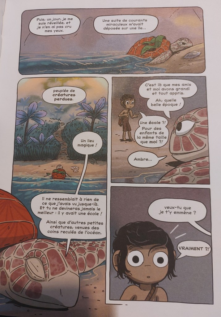 Mais, revenons à nos moutons ou plutôt à notre héros. Ambre est perdu dans une ville beaucoup trop grande pour lui où il rêve d’aller à l’école pour se faire des amis. Sa curiosité le mène au bord d’un établissement scolaire. Voir les enfants s’amuser dans la cour de récré lui donne très envie de partir à leur rencontre et de jouer avec eux. Perché sur un rocher, il est délogé par une balle perdue et s’écrabouille aux pieds d’un charmant bambin. Charmant, bof bof, celui-ci tente de l’écraser avec ses grosses paluches. Notre lilliputien prend la poudre d’escampette. Dans sa course folle, il ne remarque pas une bouche d’égout et bascule au fond du trou. Seul et pleurant à grosses larmes, le gamin est interpelé par une tortue. Ambre lui confie sa détresse, sa solitude, le souhait d’avoir des copains et le désir de se rendre en classe. Lua, l’ovipare, lui conte alors l’endroit où elle a passé ses jeunes années entourée de camarades et de professeurs tous plus sympas les uns que les autres. Ce lieu magique se dissimule dans l’océan. Sa nouvelle complice propose de l’y conduire.
