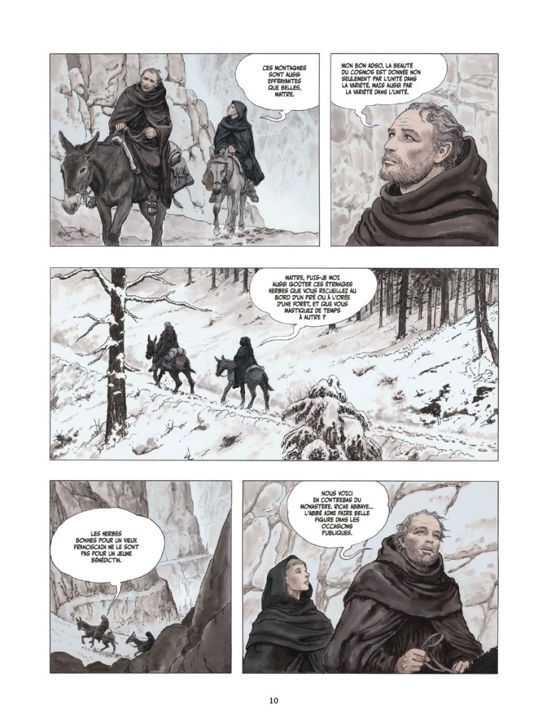 Le bédéiste a naturellement procédé à des ellipses mais il reste fidèle au texte initial conservant le mystère épais qui entoure le succulent polar médiéval. On découvre progressivement les disparitions étranges des moines bénédictins et on guette la confrontation théologique à laquelle vont se livrer franciscains et représentants du pape avant de se diriger sur une rencontre et un final attendu mais magistral.